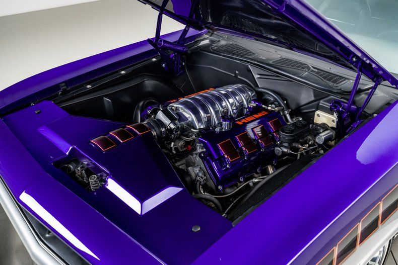 Power comes from a modern 6.1L Hemi V8 built by Arrington Performance, producing more than 525 horsepower. Electronic fuel delivery is handled by a Holley Sniper EFI system. A Tremec TKO500 5-speed manual transmission sends power to a Chrysler 8.75" rear end equipped with 3.91 gears and a limited-slip differential. The chassis combines a torsion-bar front suspension with a 4-link rear setup and coilover shocks, creating a stance and handling profile consistent with serious pro-touring builds. Stopping power comes from four-wheel Baer brakes with drilled and slotted rotors, assisted by a Hydratech power brake unit. Long-tube headers feed a stainless dual exhaust system with an X-pipe and chambered mufflers, exiting through custom tips integrated into the rear valence. Polished Bonspeed wheels, 18" up front and 20" in the rear, are wrapped in Nitto performance tires to complete the car's aggressive stance.