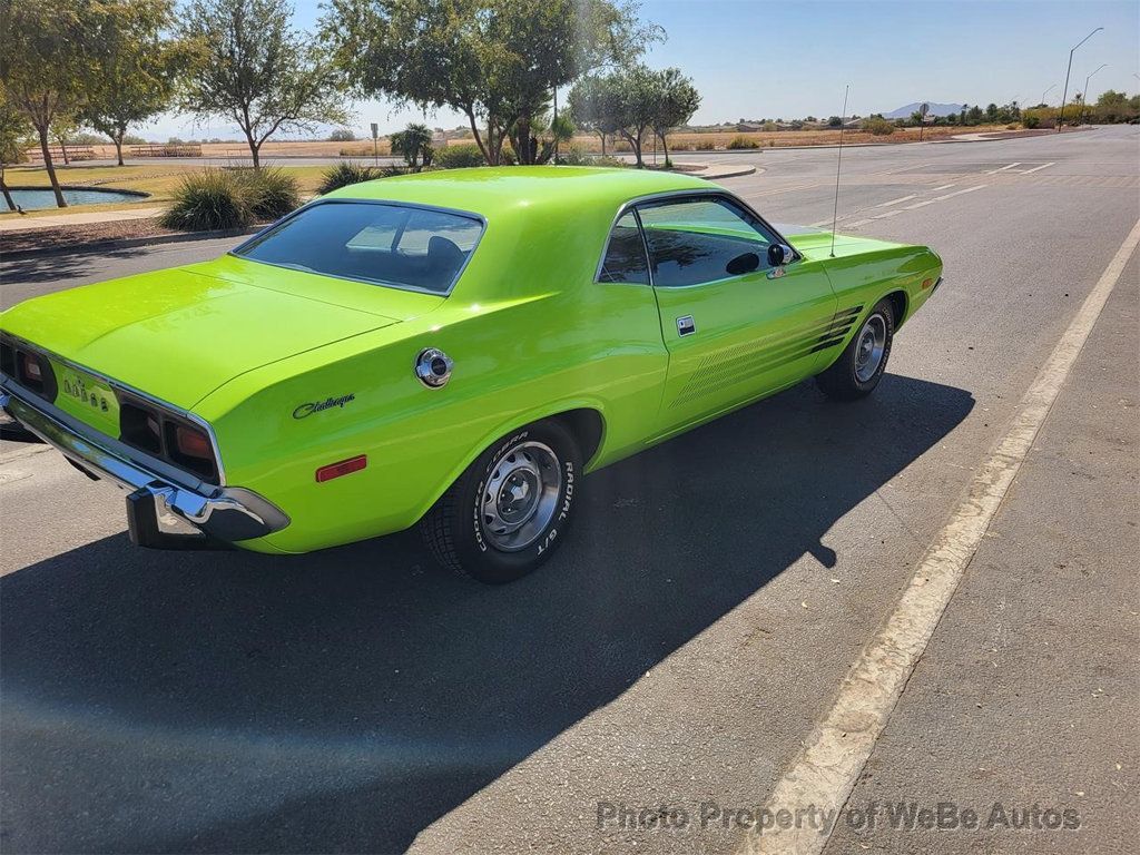 1973 Dodge Challenger For Sale Engine ~ 1968 440ci Block #PT440S 23980667 (Trenton) 0.30 Over Bore With O-Ring Deck, JE Custom Forged 10.5-1 Pistons, 440 Richard Petty Nascar Rods, Shot-Ping Steel Crank, Dual Pattern Billet Camshaft, Isky Rockers, Springs And Retainers With Custom 3/8 Chromoly Pushrods, Cylinder Head #2843906-4 Bush Guides With TRW Intake Valves And Hard Seats (Specifications Included). Transmission ~ 1968 727 Torqueflite Completely Rebuilt With B&M High Performance Kit (HEMI 9 Clutch Discs) Deep Oil Pan With Drain Plug (2 Additional Quarts) And 2,800 Champ Stall Converter. Original Drivetrain ~ 340ci V8 With A Torqueflite 3 Speed Automatic Transmission Fuel System ~ 440 Torquer Aluminum Manifold, New Holley 850 CFM Carburetor, Fuel Pump And Filter, Edelbrock Air Cleaner Housing And Filter. Ignition System ~ New Spark Plugs, Distributor Cap/Rotor, 7mm Carbon Wires, 100kv Coil And Control Module, Distributor Recurved To Match Carb And Camshaft. 7290 Driveshaft (2 5/8 Yoke) Replaced Axles With Green Bearings, Seals And Gasket, 8 3/4 Sure-grip 2.94 Rear Differential. All Body Sheet Metal Is Original, Only Minor Rust Was Present, Lower Front Passenger Door About 2 Inch Square And Where Vinyl Top Rear Molding Connected, All The Stainless-steel Moldings (Polished) Front Bumper And Bumperettes And Sport Mirrors Chrome Are Original, Rear Bumper And Bumperettes Were Re-Chromed. Body And Paint ~ 11-Month Restoration, Painted In Original Factory Color, Install Custom 1/4 Panel Supports At Rear 1/4 Window To Prevent Cracking (Typical Of E-Bodies) Replaced Both Door Upper Hinges And Hood Hinges, Trunk Mat And Side Marker Lamp Assembly, Install Graphics. Factory Options The Following ~ Power Front Disc Brakes With Rebuilt Front Calipers, Combination Valve And Power Booster, New Master Cylinder, Brake Pads And Flex Hoses. Rear Brakes ~ Original 10 Drums (Machined) New Wheel Cylinders, Shoes, Hardware And Flex Hose. Rear Suspension ~ All Sandblasted, Rear Differential Housing And Leaf Springs Coated In Black Zinc Chromate, Sway-Bar And Brackets, Front Hangers, Rear Shackles, Spring Plate And Diff Housing U-Bolts Coated In Yellow Zinc. All New Bushings And Dual Stage Gas Charged Shock Absorbers. Front Suspension ~ Power Steering, 3 1/2 Ration Gear Box And Power Steering Pump Rebuilt. New Power STR Lines, Inner/Outer Tie-Rods, Pitman And Idler Arms, Upper/Lower Control Arm Bumpers And KYB Dual Stage Gas Shock Absorbers, All Sandblasted, Sway-Bar And Brackets Coated In Yellow Zinc. Wheels/Tires ~ All Sand Blasted (Including Spare) Painted In Factory Argent Silver, Original Lug Nuts (Only Available During Assembly) Wheel Trim Rings And Hub Caps On New P215/70R/14 Cooper GT Radials Tires, Spare Is P215/70R/14 Hankook H724 Radial. A/C-Heater System, Rebuild A/C Compressor, EPR Valve, New Hoses, Receiver Drier, Condenser And Heater Valve, Original Steel Lines, Expansion Valve And Blower Motor. All New Cooling System Hoses, Heater Hoses, Vacuum, Evaporator And Fuel Hoses And Engine Drive Belts. Exhaust System ~ Original 1974 Appliance 4-Bolt Flange Headers (Purchased In 1975) Blasted And Ceramic Coated, Dual 3 Stainless-Steel Tubing To Turbo Mufflers, Out To Stainless-Steel Dual Exhaust Tips (Exact Copy Of Originals) Factory Center And Rear Exhaust Tip Hangers. Electrical System ~ All Interior, Dash And Rear/Front Light And Wiper (Engine Compartment) Hardnesses Are Original, Engine Hardness Replaced With New, Alternator (Brushes Replaced) 3 Speed Wiper And Washer Pump Motors Are Original, New Voltage Regulator, Battery And Factory Hold Down, Neutral/Backup Switch, Engine Oil And Temp Senders, Horn Relay. Glass ~ All Original Except Windshield (Broke When Removing) Weather Stripping, Except For Belt Moldings And Truck Seal. Interior ~ Original Interior, Except Carpet And Front Seats (Redone In Original Material), Light Group (Includes Dome, Glove Box, Ash Tray, Map Light, Center Console, And Trunk Lamp) Remote Driver Side Outside Mirror And Hood Release, Valet Keyed/Locking Glove Box And Center Console. Purchased 11/8/1988 ~ Assembly Plant, Hamtrack, Detroit MI, 10/09/1972 Never in an Accident For Sale By Owner Located In Casa Grande, Arizona 85122 Take A L@@K At The Video On YouTube: https://youtu.be/4KWZZ83loLM WeBe Autos Specializes in Marketing and Advertising Muscle, Classic, Vintage and Specialty Cars. We offer Professional Photography, HD Movies, and Staging that Sells Cars. Let us showcase and sell your specialty car. Please visit our website for more details. Keep in Touch, Michael Runnalls Specialty Car Marketing & Media WeBe Autos Ltd. Long Island, NY 11780 Michael@WeBeAutos.com www.WeBeAutos.com (O)631-339-0399 (C)516-729-2003 Skype: webeautos (F)631-389-2605 - - AM/FM, Premium Sound System, Vinyl Interior Surface - Contact Michael Runnalls at 631-339-0399 or Michael@WeBeAutos.com for more information. -