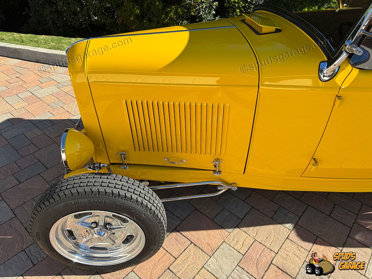 Exterior: Rumble-Bee Yellow urethane single-stage paint, "All-Steel" Brookville w/cowl vent, door hinges, curtain pockets & drains, grill shell, insert & trim, Rootlieb 20-louver hood-sides, commercial head lamps w/painted buckets, fluted lenses & chrome stanchions, front spreader bar w/license plate mount, 2.5" chopped plated windshield, dual peep mirrors & wind-deflectors, Sid Chavers "BOP-TOP" tan soft-canvas, chrome rear deck handle & spreader bar, 1950 Pontiac tail lamps w/blue-dot lenses, American Racing Salt-Flat 16" wheels polished, Excelsior Stahl Sport Radials (F-5.00x16 R-7.50x16).