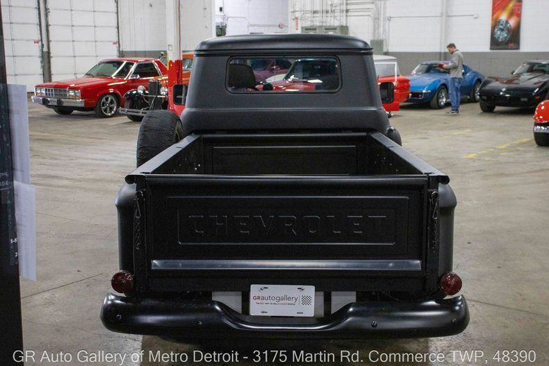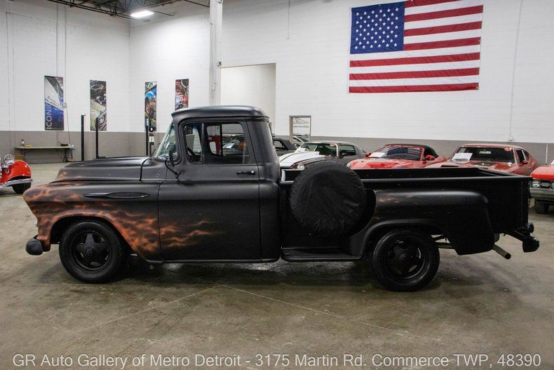 GR Auto Gallery is pleased to present this 1957 Chevrolet 3600 Stepside for your consideration. This custom-built truck comes finished in a Rat Rod Black exterior with painted flames over a clean Gray interior and shows just 69 miles since its fresh restoration. Powering the truck is a 400 cubic inch V8 paired with a TH350 automatic transmission. This 3600 underwent a frame-off restoration that began in 2012 and was completed in 2021, with the engine having been rebuilt in 2014. The fuel tank has been relocated to the rear under the bed, and the truck features a Mustang II power rack and pinion front suspension for improved handling. Additional highlights include a tilt steering column, new gauges, all new wiring, an oak finished bed, dual exhaust system with Flowmaster mufflers, Vintage Air heater, lowered stance with rear air shocks, vintage charcoal tinted glass, Sony speakers, Pioneer stereo, a kill switch located in the center console, and much more. Drive this one out of our showroom or have us assist with shipping it to you anywhere in the United States! Don't hesitate to call us with any questions or for more information.