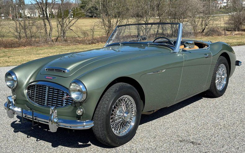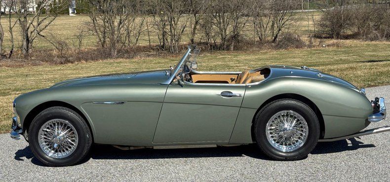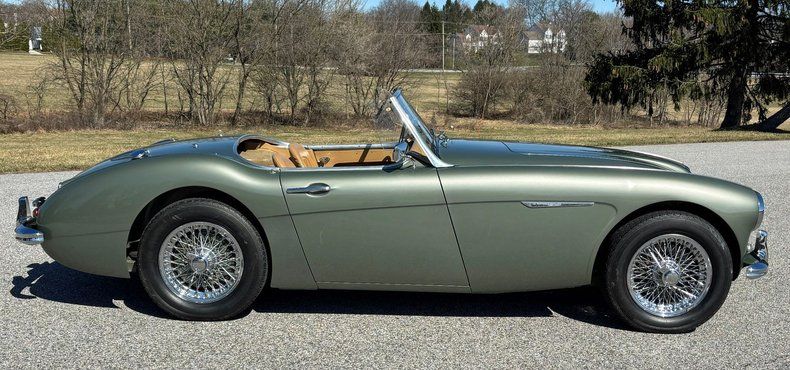 1959 Austin Healey 100-6 BN6 Roadster, beautifully restored, gorgeous Smoke Green paint, excellent Black soft top, gleaming chrome and trim, immaculate Tan leather interior, smooth and powerful 2900cc 124 HP 6-cylinder engine, upgraded to a fully syncromesh 5-speed overdrive transmission, stainless steel dual exhaust, chrome knock-off wire wheels, Vredestein radial tires, runs and drives wonderfully!