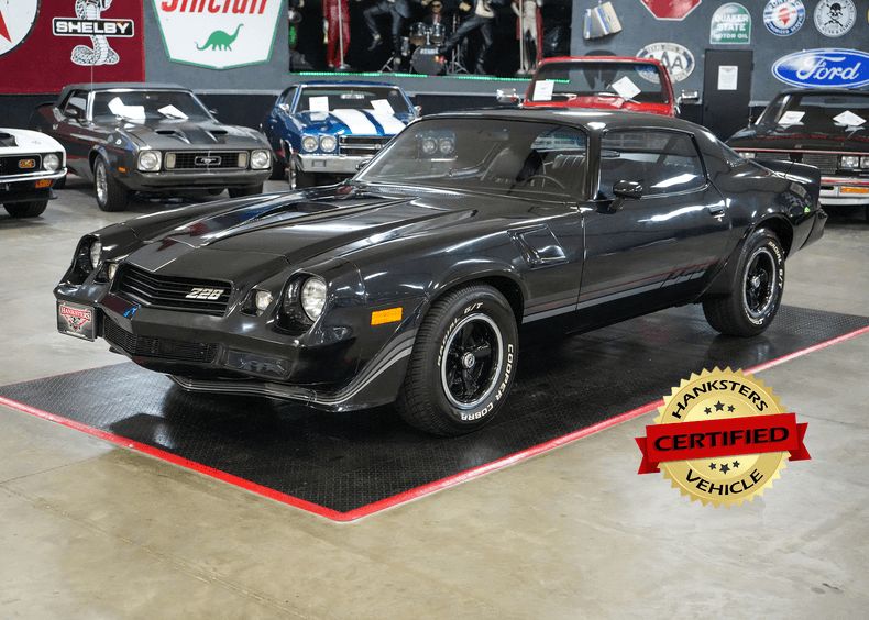This 1980 Chevrolet Camaro Z/28 delivers classic muscle car appeal with a 350 Small Block Chevy V8, GM TH350 automatic transmission, and GM 10-bolt POSI rear end with 3.31 gears. Performance upgrades include a Holley Street Dominator intake, Edelbrock 600 CFM 4-barrel carburetor, HEI distributor, aluminum radiator, and flex-style cooling fan. Comfort features include power steering, power brakes with front discs, and a Jensen Bluetooth radio with Kenwood speakers. It sports black leather interior, 15" OEM Z/28 rally wheels, and Cooper Cobra Radial G/T tires. Finished in bold black with Z/28 decals. Shipping and warranty included at full retail price.