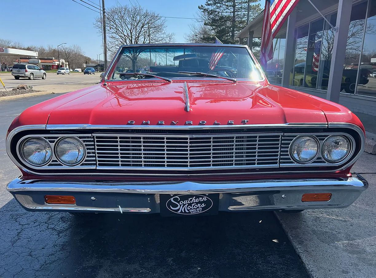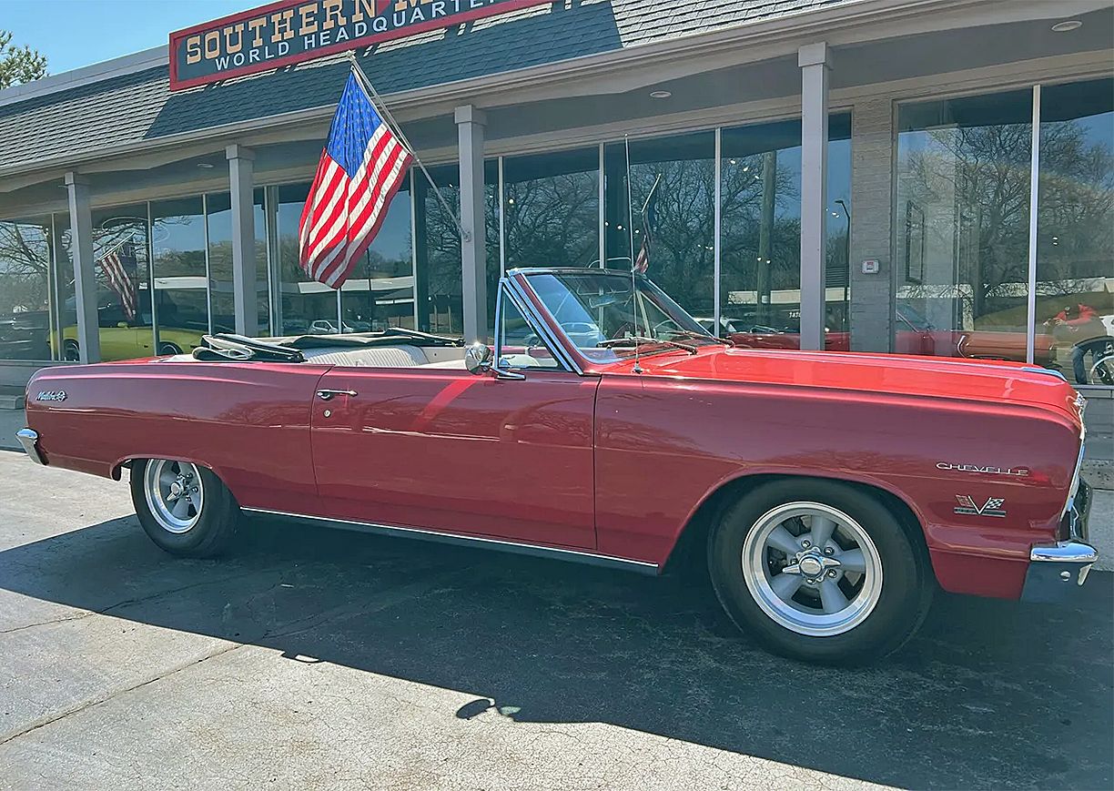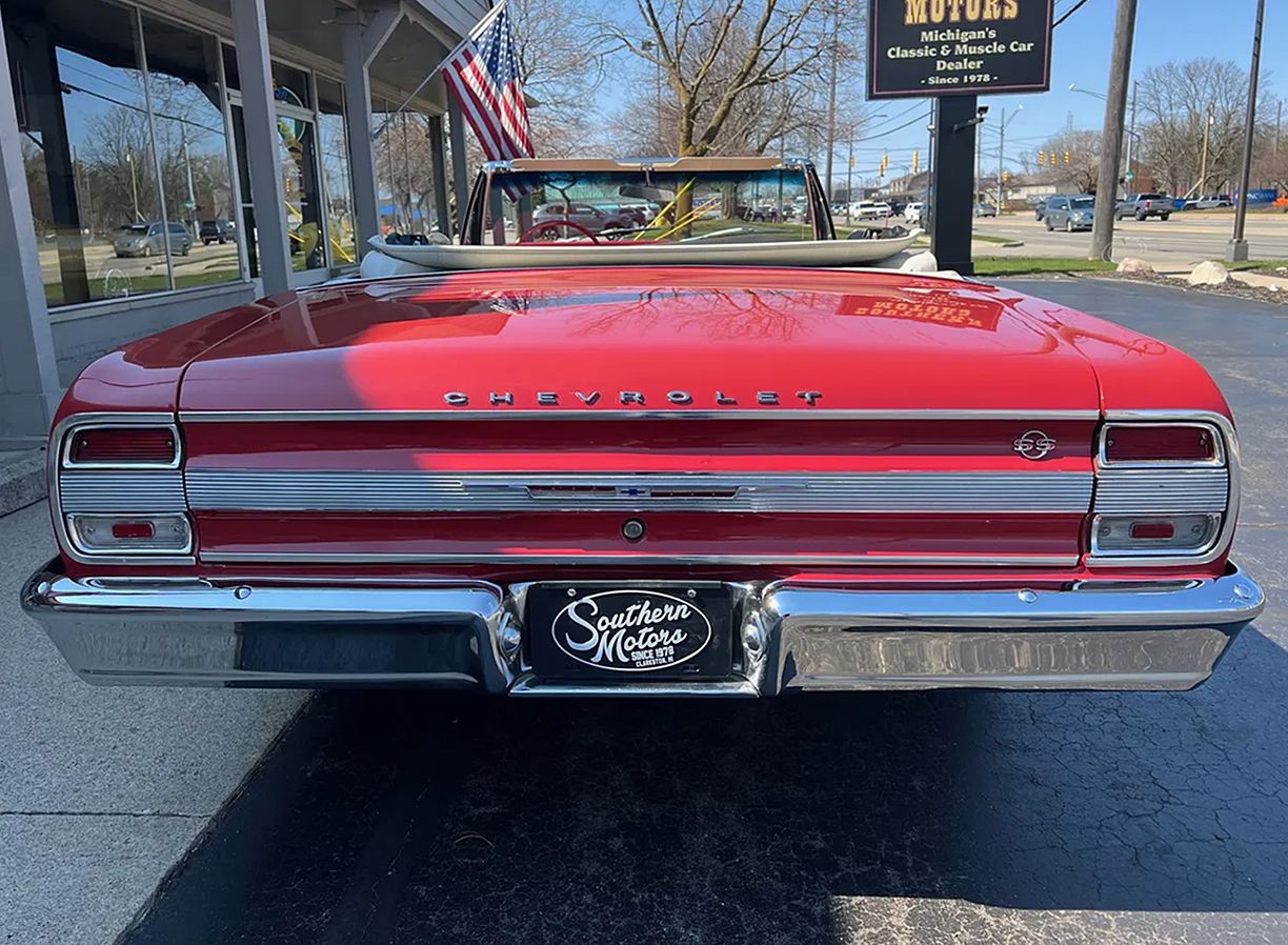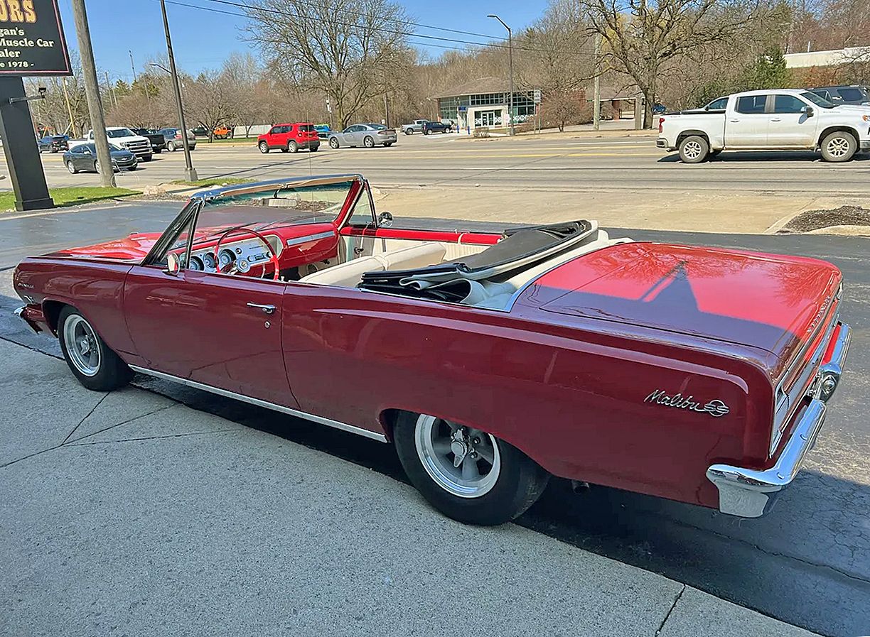 Clean Tennessee car, Ember Red paint, White convertible top, Ivory vinyl interior, 396 ci engine, Muncie 4-speed manual transmission, Holley 4 bbl, aluminum intake, HEI distributor, factory exhaust manifolds, mild camshaft, chrome air cleaner & valve covers, power steering, CPP power front disc brakes, tubular upper & lower control arms, aluminum radiator, factory bench seat, factory dash & gauges, Audiosounds radio, factory floor shifter, Flowmaster dual exhaust, 10 bolt 3.23 rear axle, boxed control arms, rear sway bar, 225/75R15 rear tires, 205/75R15 fronts, 15” American Racing Torque Thrust D wheels, factory jack with spare, Soft Ray glass, Ready to Cruise!