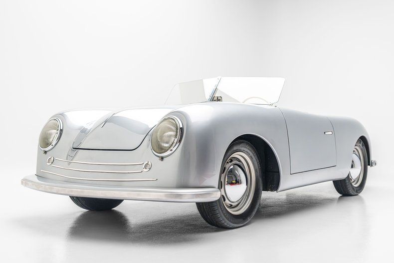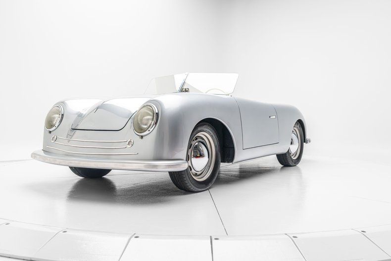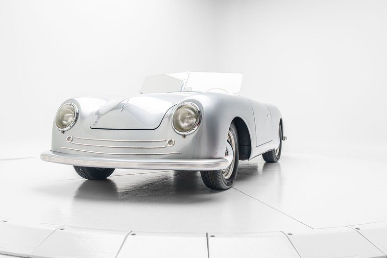 This replica of a Porsche 356/1 "Gmnd" roadster was custom built in California and features silver fiberglass bodywork mounted to a modified Volkswagen Beetle pan with a steel tube frame. It is powered by a mid-mounted 1,776cc Volkswagen flat-four linked with a four-speed manual transaxle, and equipment includes fixed-back seats, a banjo-style steering wheel, 15 steel wheels with hubcaps, front disc brakes, a split windshield, and dual exhaust outlets.