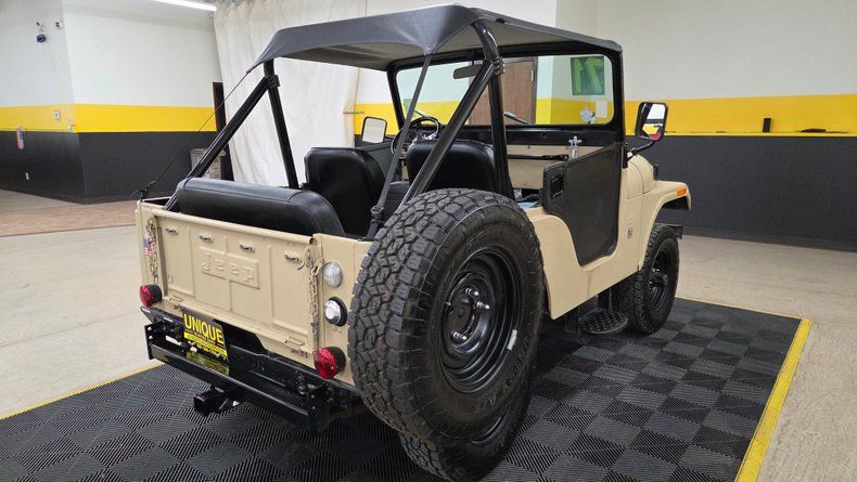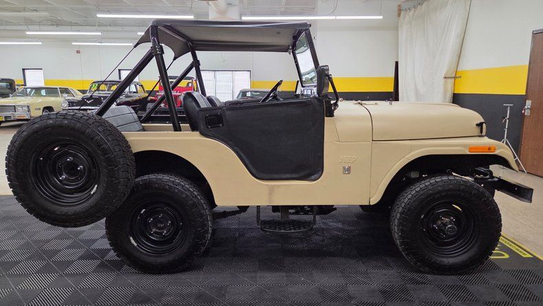 1971 Jeep CJ5, Dauntless V6 engine under the hood, a 225 cubic inch (3.7 liters) powerplant produced by Buick, which was era-correct and last offered in the CJ5 during 1971. The Jeep is finished in a flat beige-tan "sand" color, with a three-speed manual transmission shifted on the floor, and a two-barrel carburetor. 4 wheel drive of course operated by locking hubs on the front wheels and a floor lever. Riding on Toyo radial tires (235/75/15), and featuring a rear receiver hitch. The vehicle maintains many original steel body components, including the tub, hood, and front fenders. Service work performed includes a recently added heater, new water pump and gaskets, four new wheel cylinders, and upgraded wiring. It originally came from California, and an interesting addition is a safe located under the driver's seat, with the combination provided to the buyer. The interior has vinyl seats with added seat belts, soft removable doors, and a simple functional dashboard featuring an added aftermarket temperature gauge. The engine bay is clean, and the vehicle includes a battery tender and an extra steering wheel which appears original. It features a manual choke, an aftermarket windshield wiper system, and rides nicely on the road. The Jeep is a utilitarian design with bucket seats, a soft bimini top, and functional storage.
