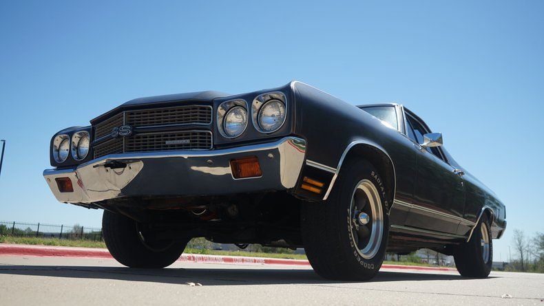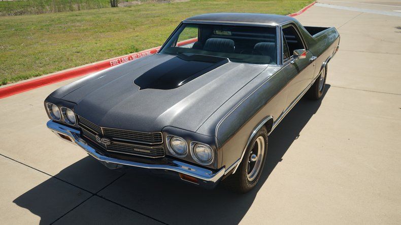 The 1970 El Camino featured a one-year-only front-end design with quad headlights and an aggressive stance, sharing much of its DNA with the Chevelle SS of the same year. This example carries the SS-inspired styling cues including the cowl-style hood and badging, giving it the look of Chevrolet's legendary Super Sport models that defined peak muscle car performance.