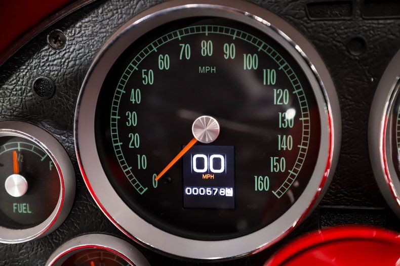 INTERIOR: You can't have enough red in a Corvette, and this interior absolutely delivers! It looks like new-if not better in some areas. It was lined with Dynamat sound deadener then fresh red carpet was installed front to back and some premium mats. The seats have been re-cushioned and upholstered in glove-soft leather, and the entire dash area has been beautifully restored. It's upgraded with RetroGauges that look stock at a glance but feature modern analog/digital functionality, along with a quartz clock. There's a Bluetooth stereo system, and the console is in excellent shape with a billet 5-speed shifter rising from it. It also features a tilt column and a Billet Specialties steering wheel. The door panels have been replaced, and it has new red seat belts. All the finishing details are in excellent condition, making this interior truly stand out.