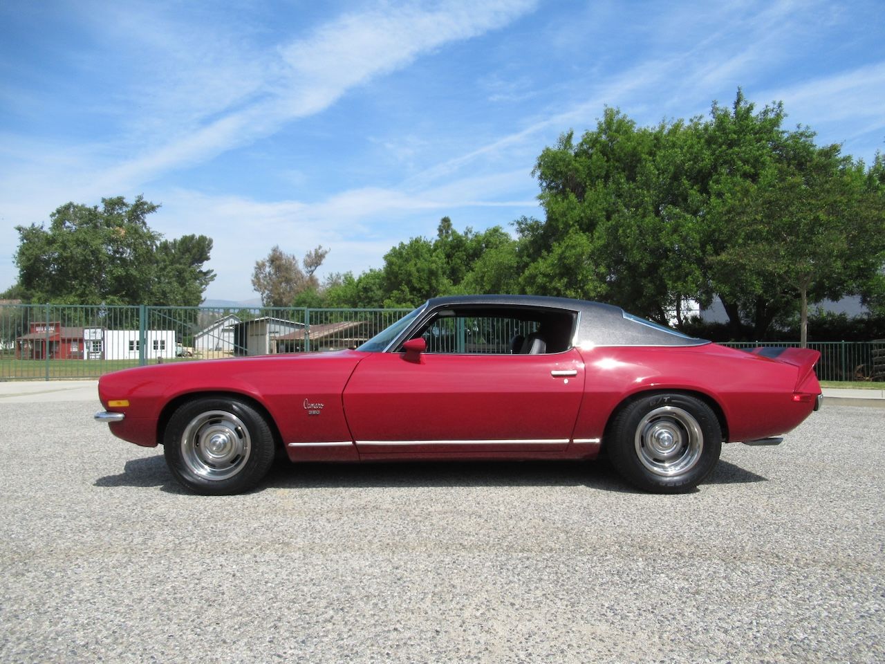 Check out this super nice Camaro LT! Finished in Dark Red with Black Stripes and a beautiful new Black Vinyl top. Other exterior options include upgraded front Split bumpers, Dual Sport mirrors with drivers remote mirror, Rear spoiler and 15 inch Staggered Rally wheels wrapped in fresh Cooper Cobra radials. Under the hood sits the original matching number 350 V8 with 4 barrel carburetor, power steering, power disc brakes and dual exhaust exiting out the rear. Power gets put to the pavement through a Turbo 350 Automatic transmission followed by a freeway friendly 10 Bolt rear differential for effortless highway runs. The Black vinyl bucket seat interior was reupholstered and comes with the factory center console with floor shifter, 3 point seat belts, original 4 spoke LT Steering wheel, new headliner, factory gauges with tachometer and an old school Audiovox AM/FM Cassette player just in case you have some of those laying around. This rust free example is a pleasure to drive and ready for some weekend fun!