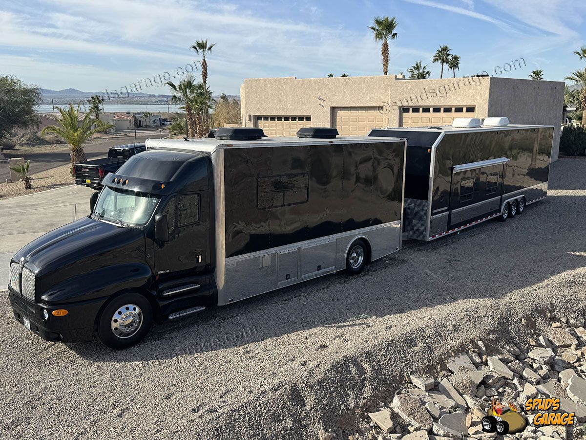 2004 S&S Welding Race Trailer 38ft 24K GVWR: Custom built By S&S Welding. Sleeps up to 6 crew members, full kitchen and bath with shower, 1 slide-out, custom full length awning & pit area lighting, ONAN CMQD 7500 Diesel Generator 1,523 hrs. More Details at Spuds Garage online.