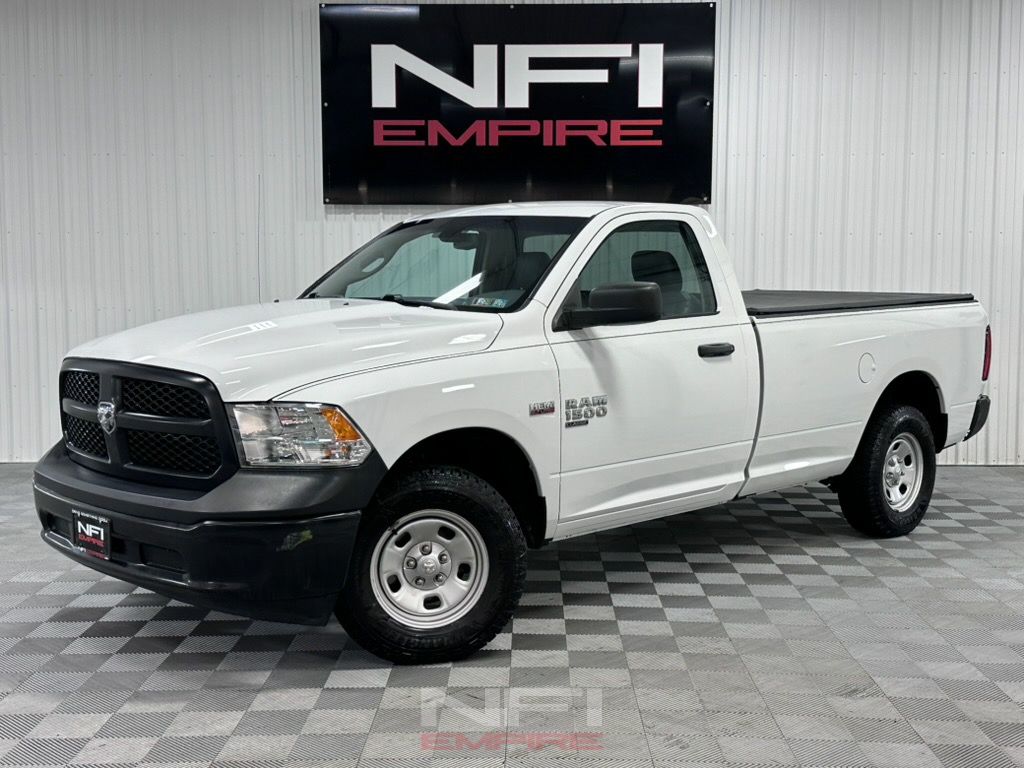 This 2020 Ram 1500 Classic Tradesman is a regular cab long bed 4x4 finished in Bright White Clear Coat over a Black and Diesel Gray interior, powered by the 5.7-liter HEMI V8 and paired with the 8-speed automatic transmission. It's a reported two-owner truck and presents as a straightforward, useful full-size pickup with the right core equipment, along with a soft folding tonneau cover and a bed liner already in place for added day-to-day practicality.