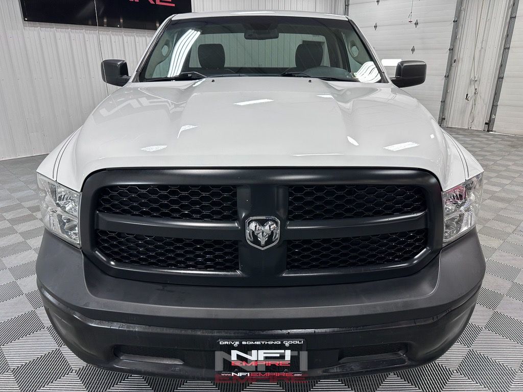 Factory equipment for this Tradesman includes the heavy-duty vinyl 40/20/40 split bench seat, Uconnect 3.0 with integrated voice command and Bluetooth, power windows with front one-touch-down functionality, power locks with remote entry, power-heated mirrors, a rear back-up camera, speed control, a vehicle information center, media hub with USB, auxiliary, and charge port, and a front armrest with three cup holders. It was also equipped with trailer-tow wiring including 4-pin and 7-pin connections, a locking tailgate, 4-wheel disc anti-lock brakes, electronic stability control, a 3.21 rear axle ratio, a 32-gallon fuel tank, tire pressure monitoring display, full-size spare tire, automatic halogen headlamps, black front and rear bumpers, black grille, and 17-inch steel wheels that are currently fitted with Goodyear Wrangler Workhorse AT tires.