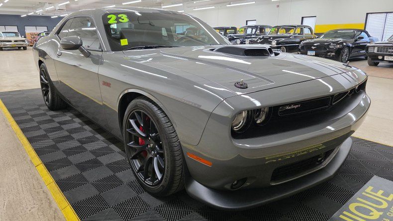 LOW MILE 2023 Dodge Challenger Shakedown Special Edition, with Scat Pack. ONLY 921 MILES on the odometer! Destroyer Gray paint with Nappa/Alcantara performance ventilated bucket seats embroidered with the Scat Pack logo, confirming it has the Scat Pack RT package. The car includes a host of premium features such as heated and ventilated seats, a premium stitched steering wheel, Brembo six-piston brakes, and the 392 cubic-inch (6.4L) HEMI V8 engine paired with an eight-speed TorqueFlite automatic transmission, with auto stick and paddle shift capability. The Shakedown Special Edition package brings unique styling elements like the shaker hood, flat black and red highlighted stripes, hood pins, and a chin spoiler, preserving the classic muscle aesthetic with modern refinements. Exceptional condtion exterior and interior, noting tinted windows, original Pirelli tires, and a clean Carfax report. The technology suite includes Uconnect, dual climate control, launch control, line lock, active exhaust, adaptive dampening suspension (Night Dynamics package), rain sensing wipers, and active headlamp control. On the road, excellent cornering, the new-car feel, and amazing condition stand out, with a level of power available that makes it exciting to drive. Additional details such as window stickers, manuals, and hood pins (never installed) are included with this vehicle.