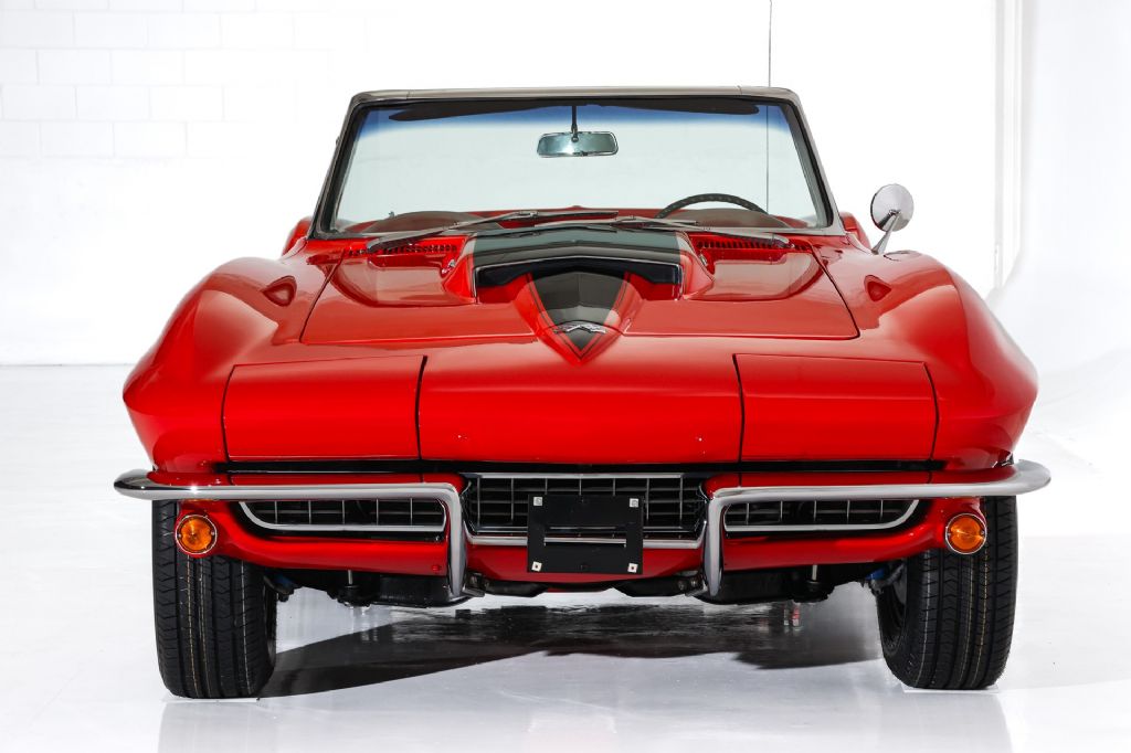 An extensive restoration was completed on this Rally Red 1967 Corvette L71 roadster with gorgeous Red leather interior. Rare one year only ominous black stinger hood over that infamous 427/435hp big block power plant topped off with a tri-power, three carburetor setup and nicely optioned with factory side exhaust and rolling on turbine styled bolt on wheels and brand new redline radials that match the car perfectly.
