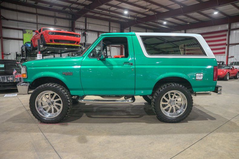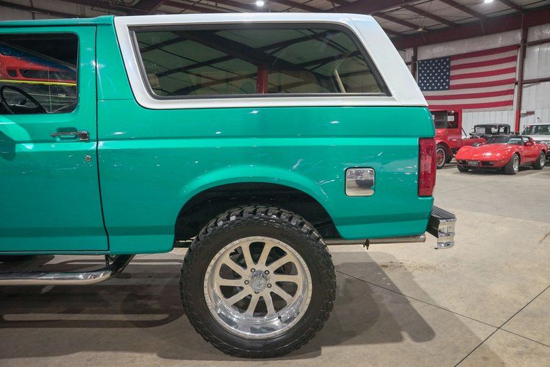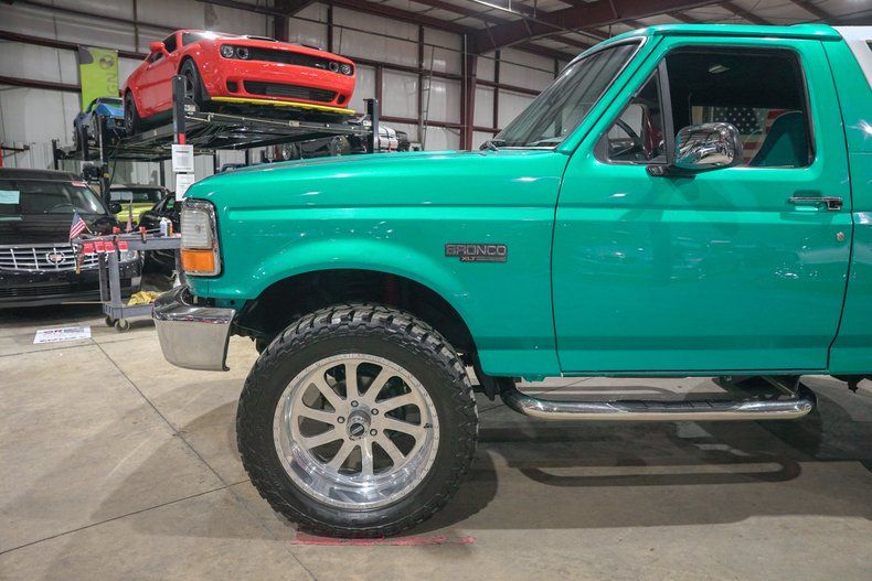 GR Auto Gallery is excited to present this 1995 Ford Bronco XLT finished in Green Metallic with a white removable top over a fully custom interior. This Bronco has undergone a full frame off restoration, bringing it back to life with fresh paint, new flooring, and a completely reimagined interior. The bold green exterior paired with chrome bumpers and massive 22 inch chrome wheels gives it a head turning presence, while still keeping the classic Bronco shape that enthusiasts love.