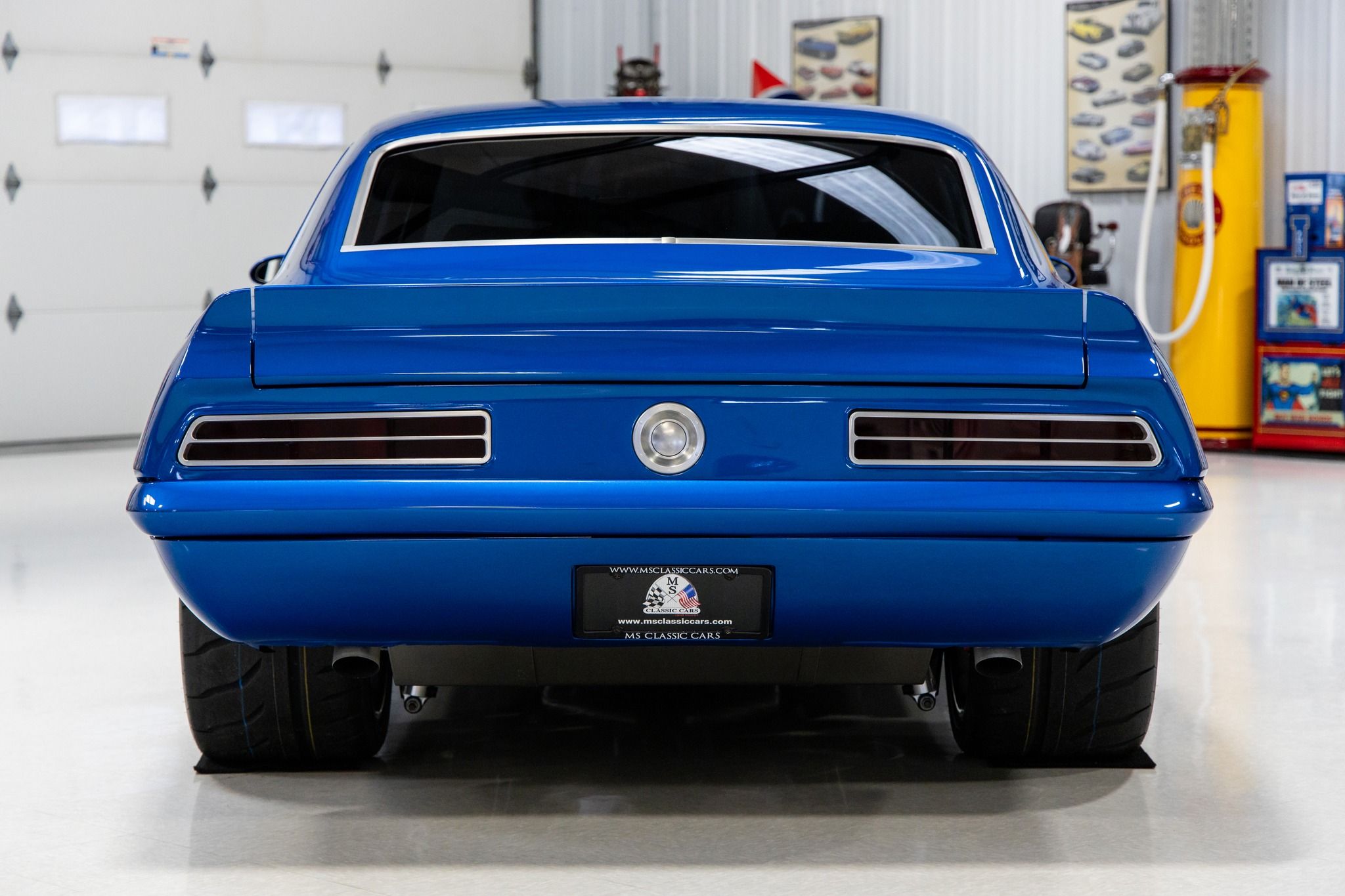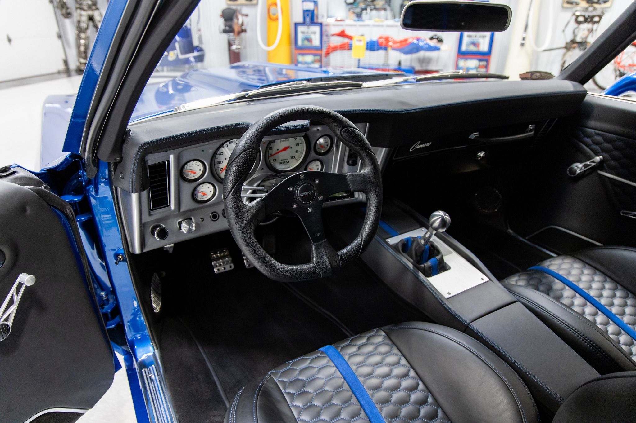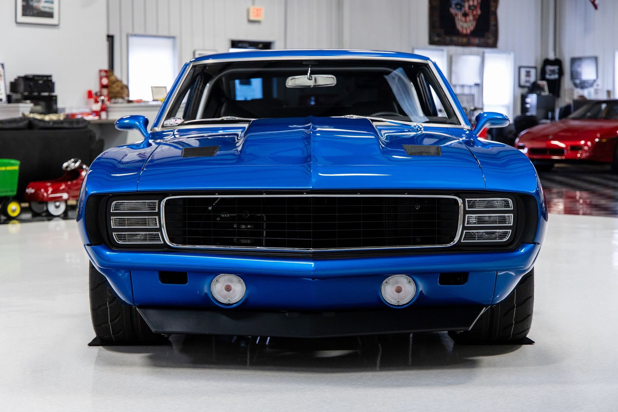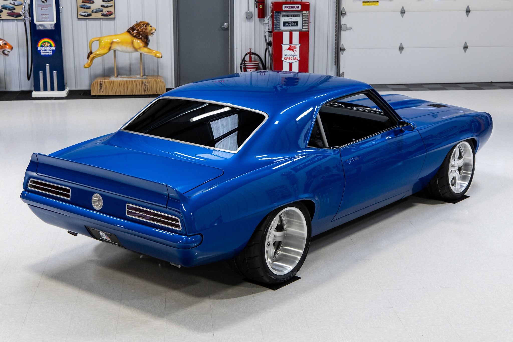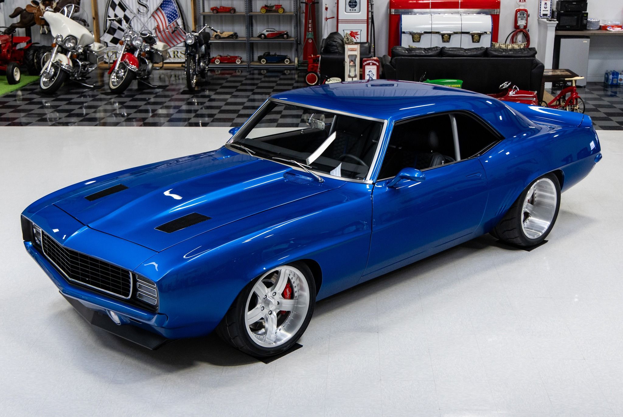 Known as, “Blue My Mind” – this '69 Camaro is the ultimate pro-touring muscle car. The one-of-a-kind design puts it in a category by itself. As the original VIN number indicates this car was originally built in Norwood, Ohio as a 1969 Camaro Coupe with an 8-cylinder. It was the product of a show quality restoration utilizing high quality parts throughout. The custom body modifications include a cowl induction hood with vents, Kindig-It Design recessed door handles, 3” extended rocker panels and molded rear spoiler with quarter extensions both with 10-gauge steel. It was finished in the gorgeous color of Corvette Laguna Blue which is also called Blue My Mind. Some other exterior features includes all new glass, Detroit Speed electric headlight covers, Vision VF4 slanted oval mirrors, Anvil tucked front bumper, Fesler LED taillights, recessed billet gas cap, tucked rear bumper, molded license plate on lower valance and brushed trim. It has a killer stance on custom Bonspeed brushed wheels that are 18x10 on the front and 18x12 on the rear. The wheels are mounted to new Toyo Proxes R888R Competition Street Legal tires. The rear was outfitted with Detroit Speed mini tubs to accommodate the massive 335-30-18 rear tires. The custom interior was hand stitched with black B-Cool leather and blue accents. Some of the interior features include a Detroit Speed 4-point roll cage, Flaming River keyless start, Classic aluminum dash panel, Autometer Phantom gauges, Vintage Air Conditioning, Fesler arm rests, Clayton Machine hardware, Flaming River tilt steering column, Momo Racing Quark steering wheel, Pro Car bucket seats, full console with storage, billet shifter and German velour carpeting. The sound system consists of a Kenwood head unit, 2-Kicker amplifiers, 2-Kicker 5.25 front speakers and 2-Kicker 6x9 speakers. The boxed and carpeted trunk compartment is home to the Optima Red Top battery. The hood pivots on Ring Brothers aluminum hinges. The firewall was smoothed and the Rain Gear Wiper motor was relocated under the cowl panel. The engine bay was dressed with Van Natta Fabrication inner fenders and radiator support panel. It's powered by a GM Performance 376 LS3 V8 crate engine that is rated with 525 horsepower. It utilizes a GM computer system with American Auto Wiring. The engine was dressed with a color matched AVS Motorsports Speedcover with billet appointments, custom color matched air intake, Drive Junky billet accessory drive system, Mishimoto oil separator, Mast Motorsports oil pan, Power Master alternator and MSD starter. The engine is cooled by a custom DeWitt Direct Fit aluminum radiator with dual SPAL electric fans. The engine breathes through ceramic Ultimate headers and a custom Schwartz Performance fabricated exhaust system. The engine is coupled to a Tremec T56 6-speed close-ratio manual transmission supplied from Bowler. It's equipped with a Quick Time bellhousing, Spicer U-joints and LS7 clutch, flywheel and pressure plate. The power is transferred to the Strange 9” Pro Nodular POSI rear end with 3.89 gears. Some of undercarriage features include power rack and pinion steering, Rick's Tank stainless fuel tank, Detroit Speed front sub-frame, Art Morrison rear sub-frame, Wilwood four wheel disc brakes and E-STOPP electric emergency brake. This vehicle has been completely serviced and detailed which is documented with an invoice. From the MS CLASSIC CARS Collection.