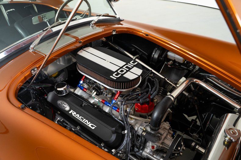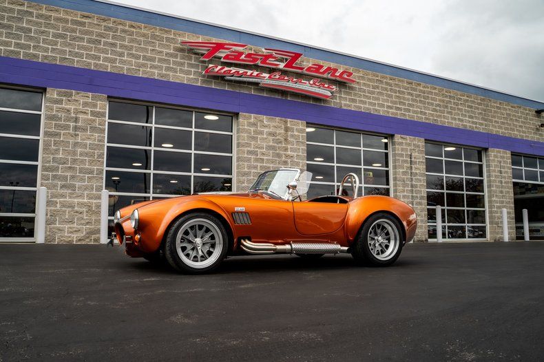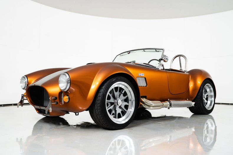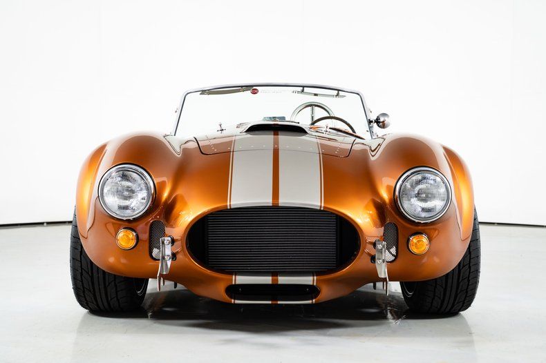 Finished in eye-catching burnt orange with gray stripes, this 1965 Shelby Cobra stands out with bold color and classic roadster proportions. Ceramic-coated headers flow into side pipes that deliver the unmistakable Cobra sound, while 18-inch knock-off wheels and a chrome roll bar complete the aggressive stance of this Backdraft Cobra for sale.