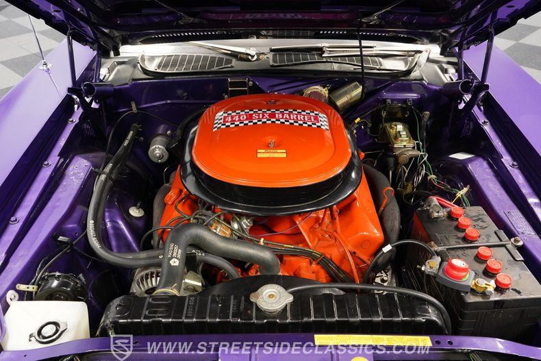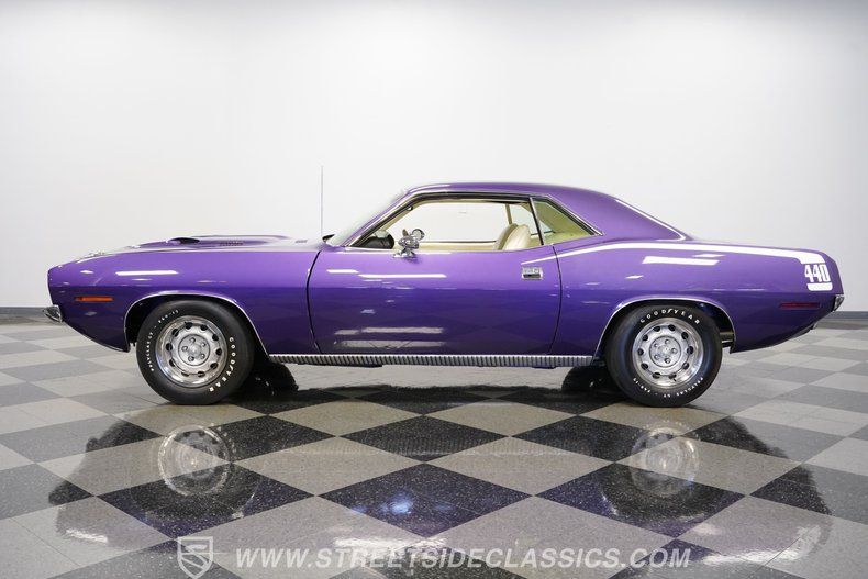 Step into a time capsule of American muscle and feel the raw power and style that defined an era. The 1970 Plymouth Cuda is not just a car, it is a statement of boldness wrapped in In Violet Metallic paint, one of the most striking Hi Impact colors ever offered. This legendary Mopar, with its factory 6 barrel 440 engine, captures the essence of late 60s and early 70s performance culture. Whether on the street or at a car show, this Cuda commands attention and respect, making it an essential addition to any true collector's garage.