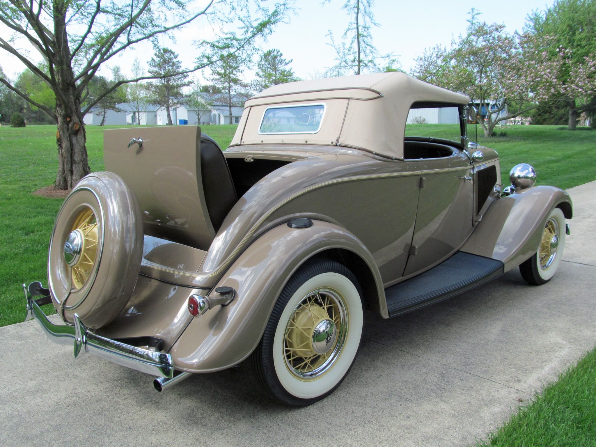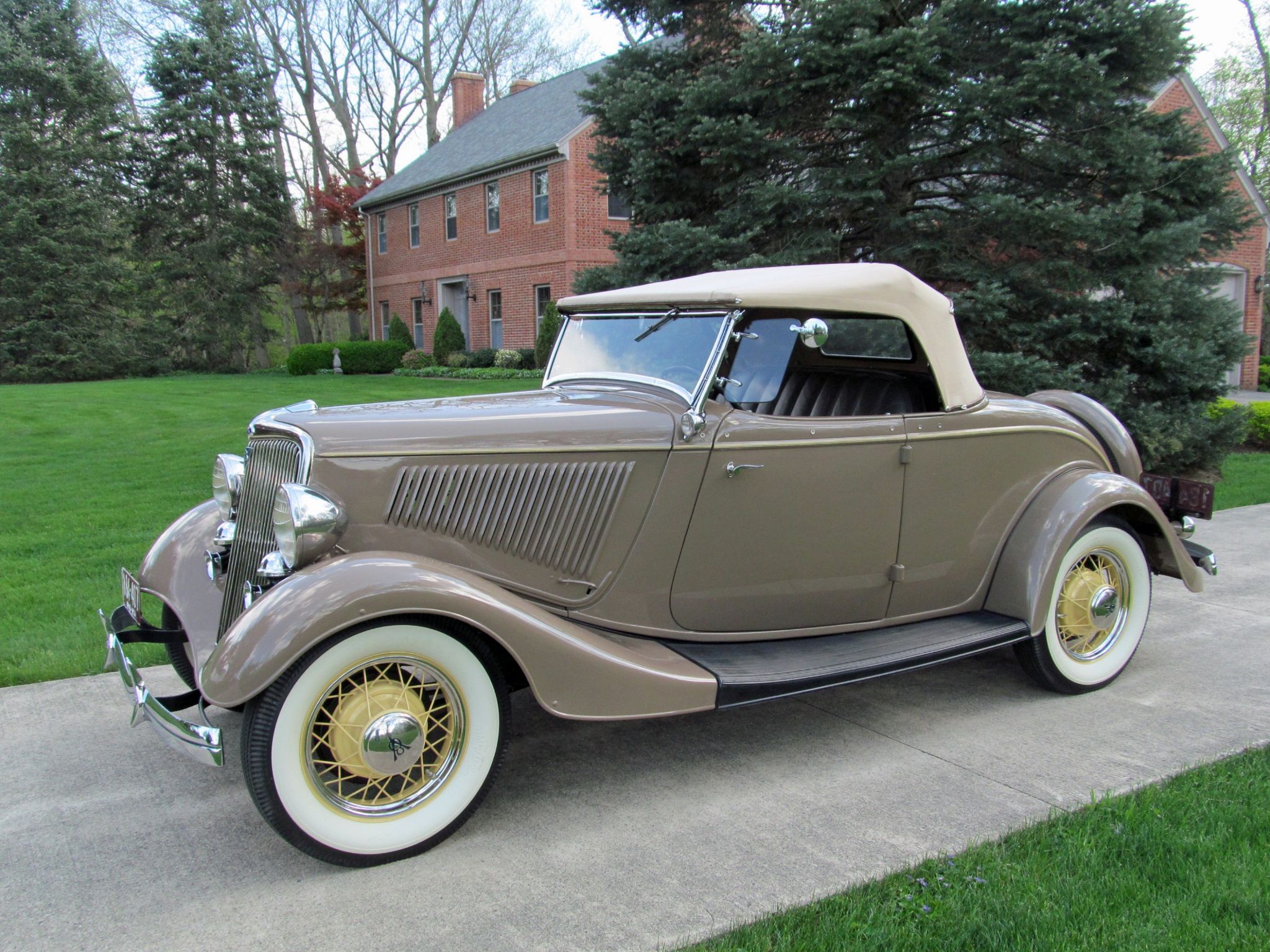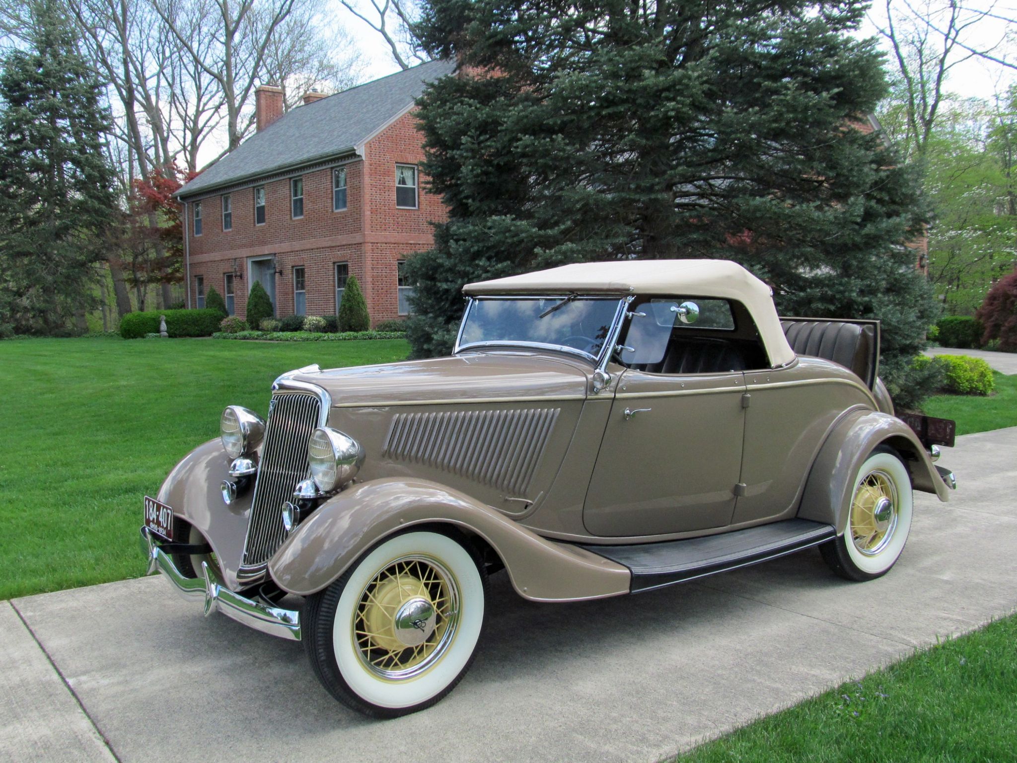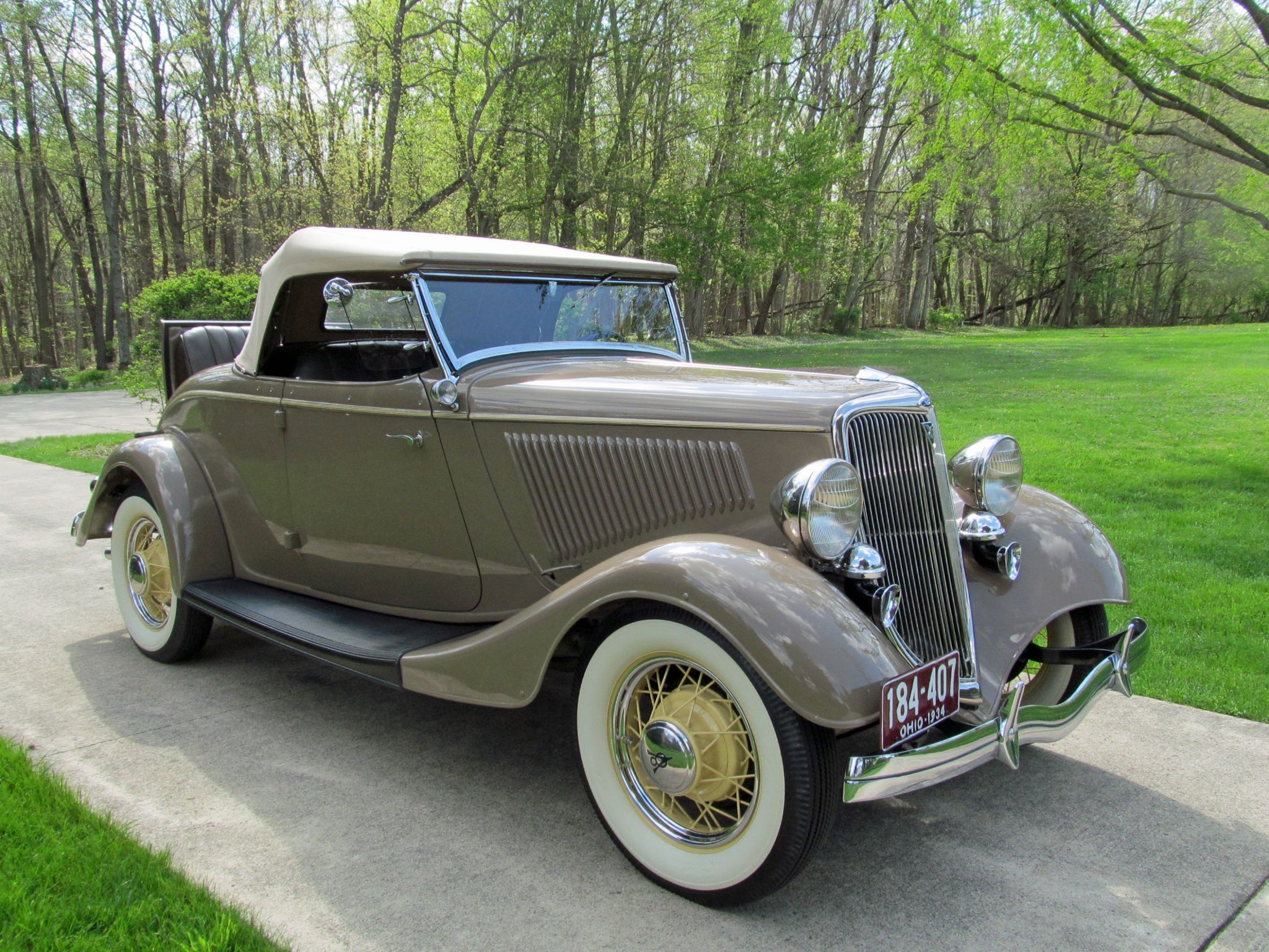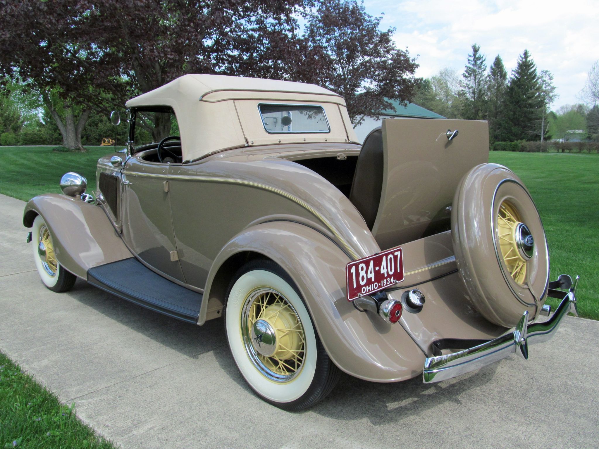 1934 Ford Model 40 Deluxe V-8 Roadster. Convertible with Rumble Seat. Call Pete or Andy 419-668-1884. Absolutely Spectacular! Off frame restoration to exacting standards. Driven less than 1,000 miles since! Very Rare automobile only 5,070 produced. Highly detailed chassis. All Steel. Tan with Straw wheels and pinstripe. Brown Leather interior. Tan cloth top with matching Side Curtains and Boot. Outstanding wood grained dashboard. 221 Cubic Inch Flathead V-8 which Ford rated at 90 horsepower. Three speed transmission. Equip with lots of great options and accessories. Wind Wings. Driver and Passenger spot mirrors. Rumble Seat. Cigar Lighter and Ash Tray. Dual Horns. Doubled Sided Whitewall Firestone tires. Locking Ford script gas cap. Ford Script Glass. Turn Signals have been added for modern touring. Ready to Drive, Show and Enjoy. Call Pete or Andy 419-668-1884 BE SURE TO WATCH THE VIDEO!