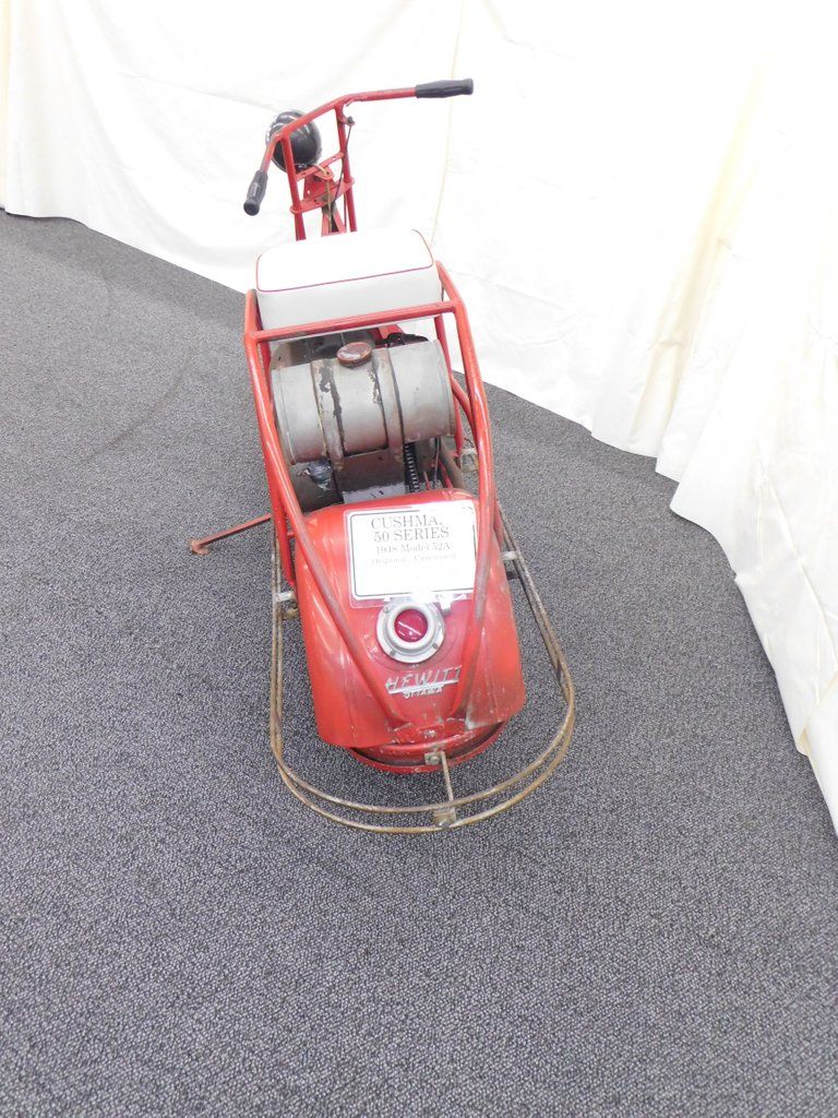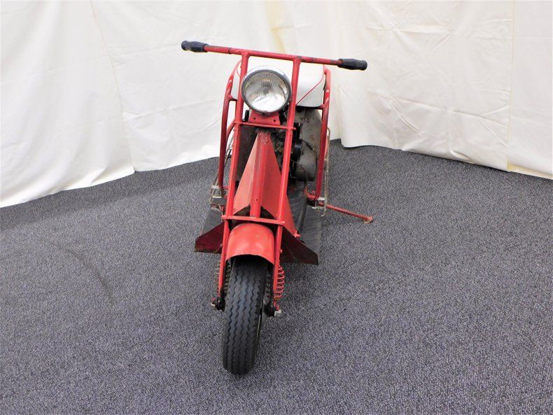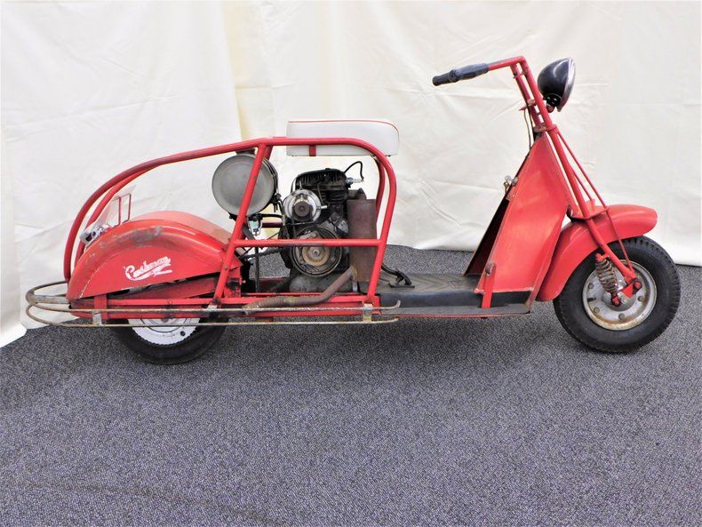 This 1948 Cushman Model 52A has "Sport" Tubular body. The scooter is Sunfast Red with single speed - no transmission. It has received a new seat, but is otherwise all original and unrestored.