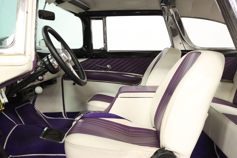 The interior is a comprehensive custom style. After all, the 1950s were known for great colors, but even back then there wasn't anything as vibrant as this. The purple and white two-tone is inspired by the exterior color theme, but it has a freshness that tells you it's a newer addition from the restoration. And you'll love the details, like the right sticking pattern and the white piping on the purple carpeting. There are nice features for easy cruising like a cup holder center console and cold-blowing air conditioning. Plus, the banjo-style sports steering wheel, Hurst shifter, and well-bolstered front bucket seats make for a better driver's classic. Even with all these upgraded features, you can still get the right classic details - including the plexiglass window speedometer. If you haven't already figured out the color theme, the stitching on the center console tells you this has been inspired by the colors for TCU. But you don't need to be a horned frogs fan to enjoy this Crown Vic. After all, it doesn't take much to replace the TCU logos. So even a Baylor fan can appreciate the rare/correct exterior color combo and the interior's coordination.