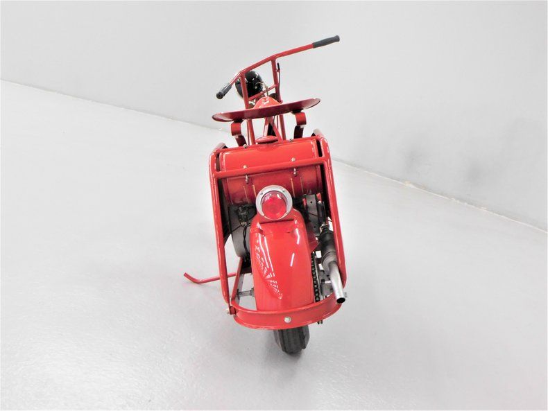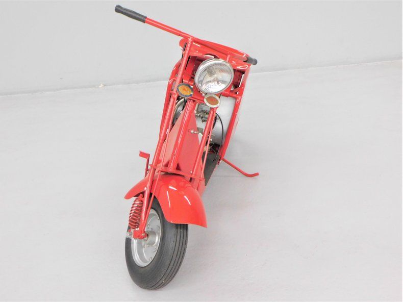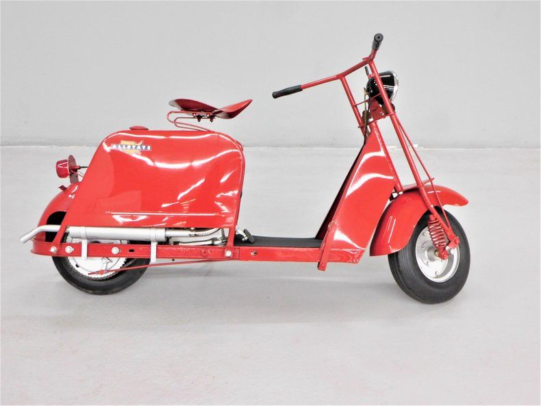 Cushman, who started making scooters in 1936, supplied scooters for Sears, who marketed all of their scooters as Allstate. This 1951 red Allstate is a Cushman production restored by Sony Sain and comes from the collection of Dennis Carpenter. This is a running scooter but it does not have a title.
