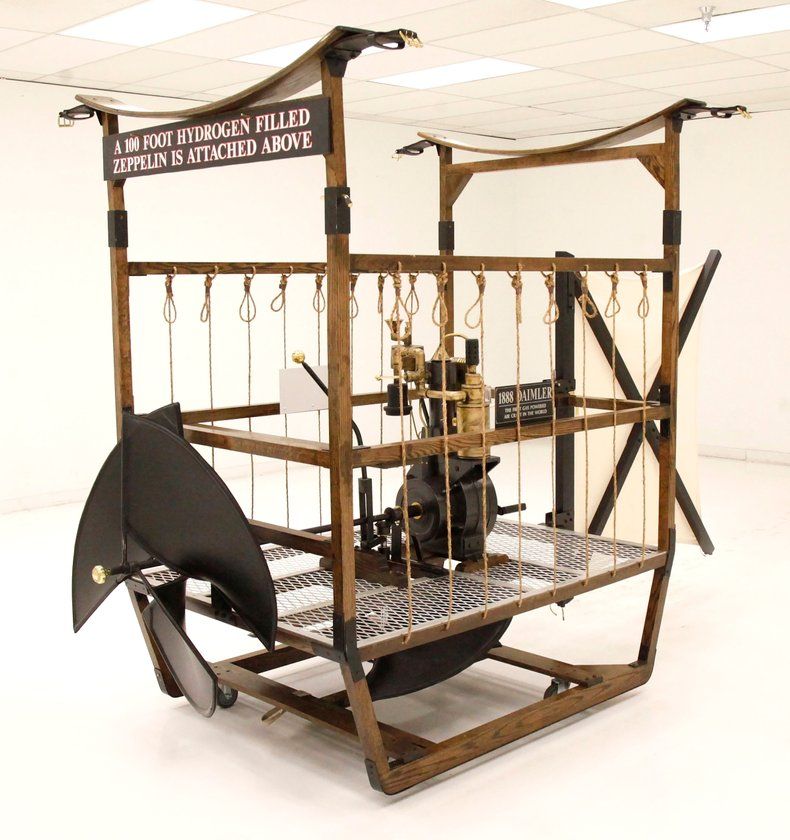 This recreation is the work of William Eggers of Goshen CT and one of many old interesting recreations to grace our Hallowed Halls. It is essentially a 150cc gas powered engine and produces 2 hp at 700 rpm. The propellers one on the bottom to control vertical movement, and the other on back controls the horizontal movement of the zeppelin. A large panel in front aids in steering the aircraft and acts as a rudder if you will.