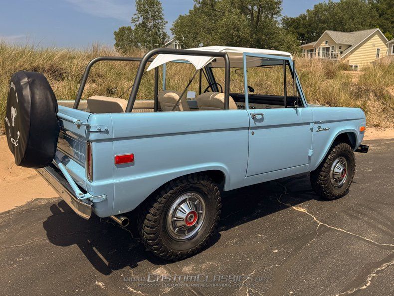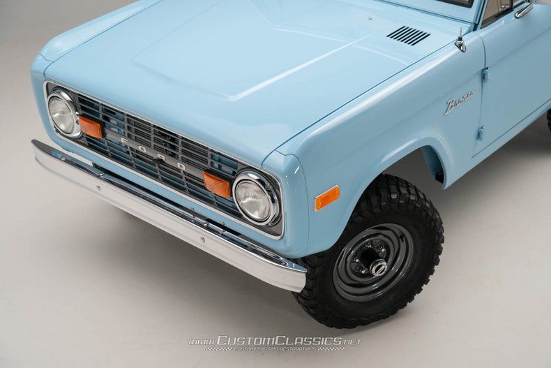 The body of this Bronco is painted in a dazzling Diamond Blue color, using BASF Glasurit paint for an industry-leading quality finish. The chassis is finished in the correct Ford satin black, and the body was stripped to bare metal and meticulously straightened. The truck has the original fender and quarter openings, giving it a classic and desirable look. It's important to note that ALL chrome and trim is new on this truck. The front of the truck features the iconic factory grille painted gray with white "FORD" lettering and finished with a new chrome bumper. The back of the truck has a "FORD" stamped tailgate with a swing-out full spare mounted on the back, chrome exhaust tips, factory taillights, and a new rear chrome bumper. The truck rides on 15-inch steel wheels painted gray to color-match the rest of the truck's details wrapped in 30-inch BFGoodrich Mud Terrain T/A KM3 tires, giving it a slightly more rugged and aggressive stance. (The wheel covers as seen in the outdoor photos will be included in the sale.)