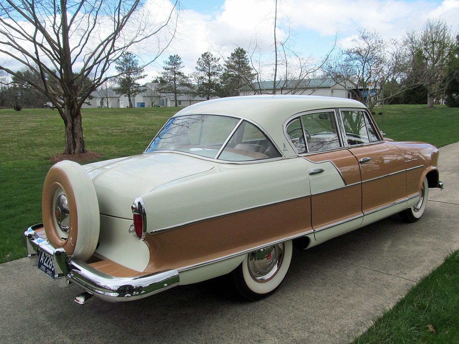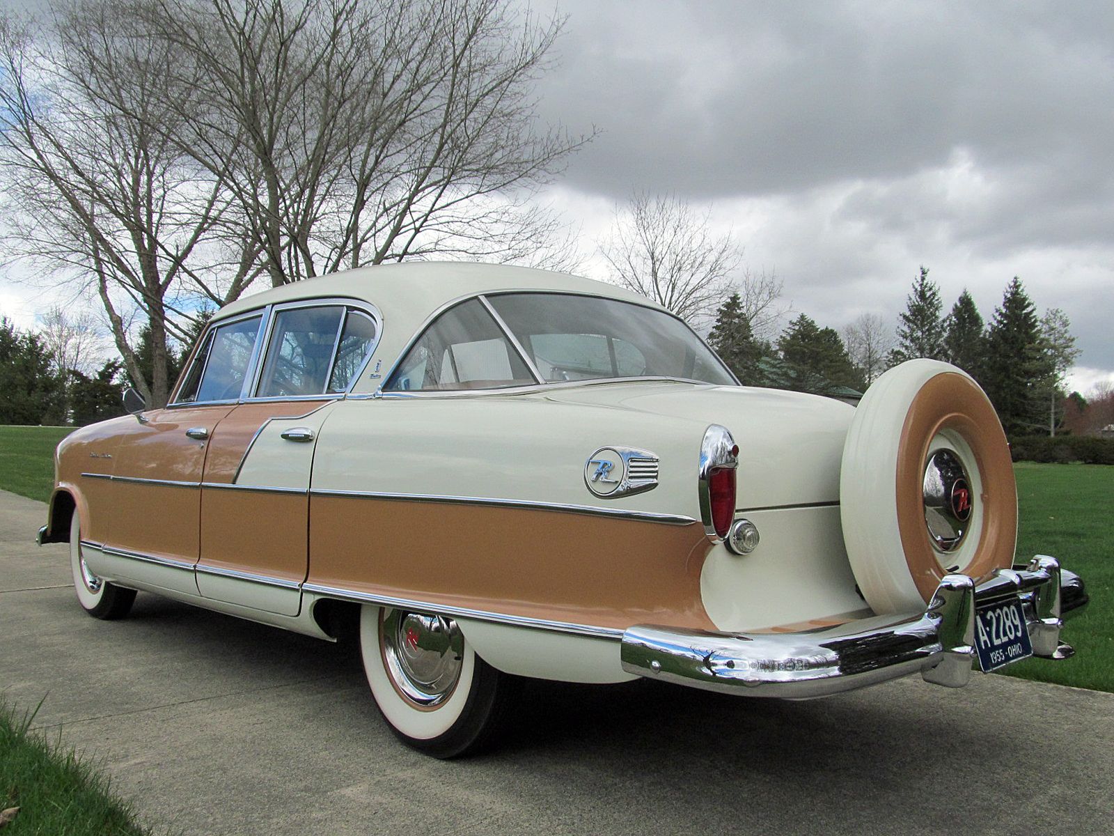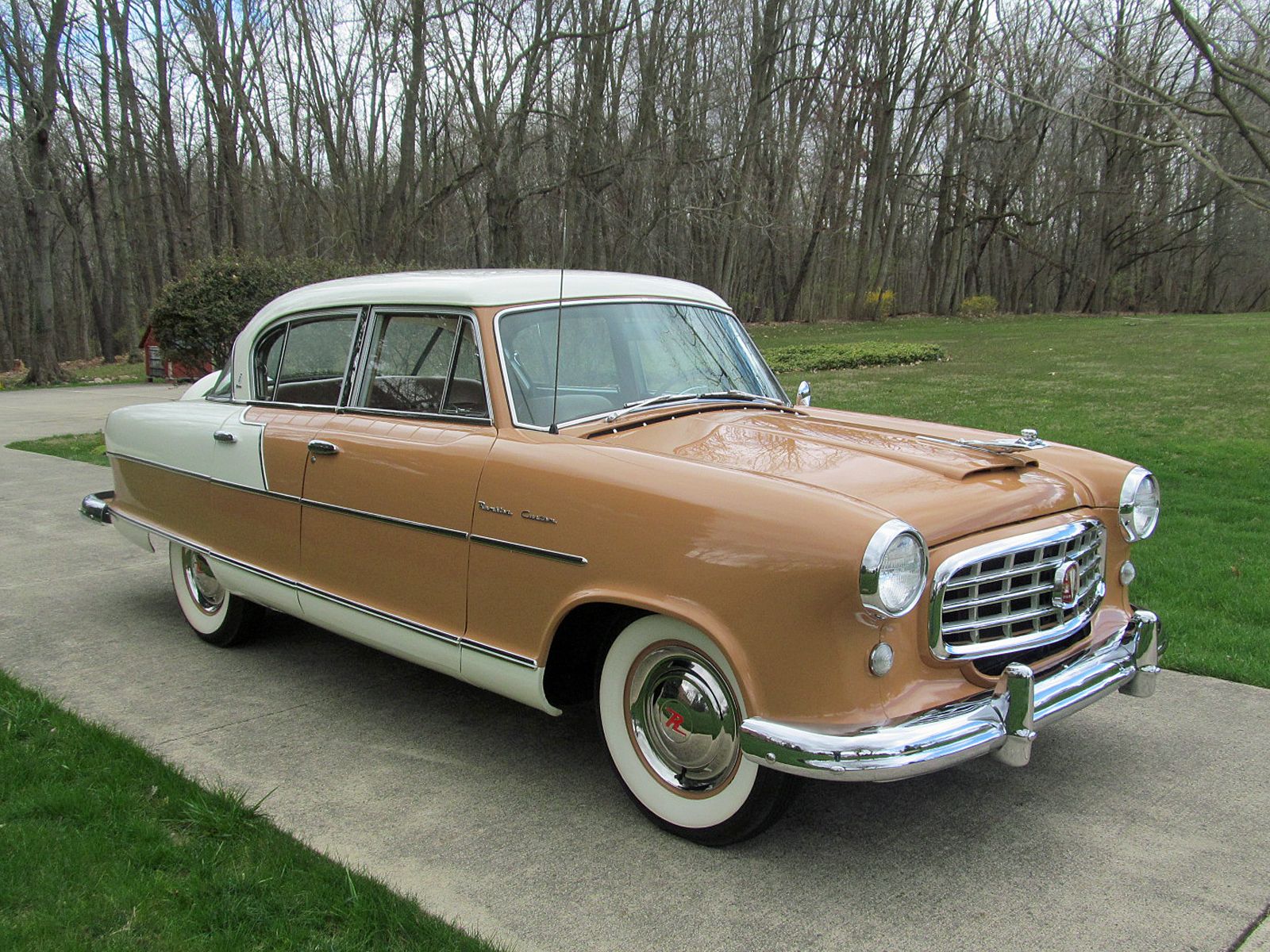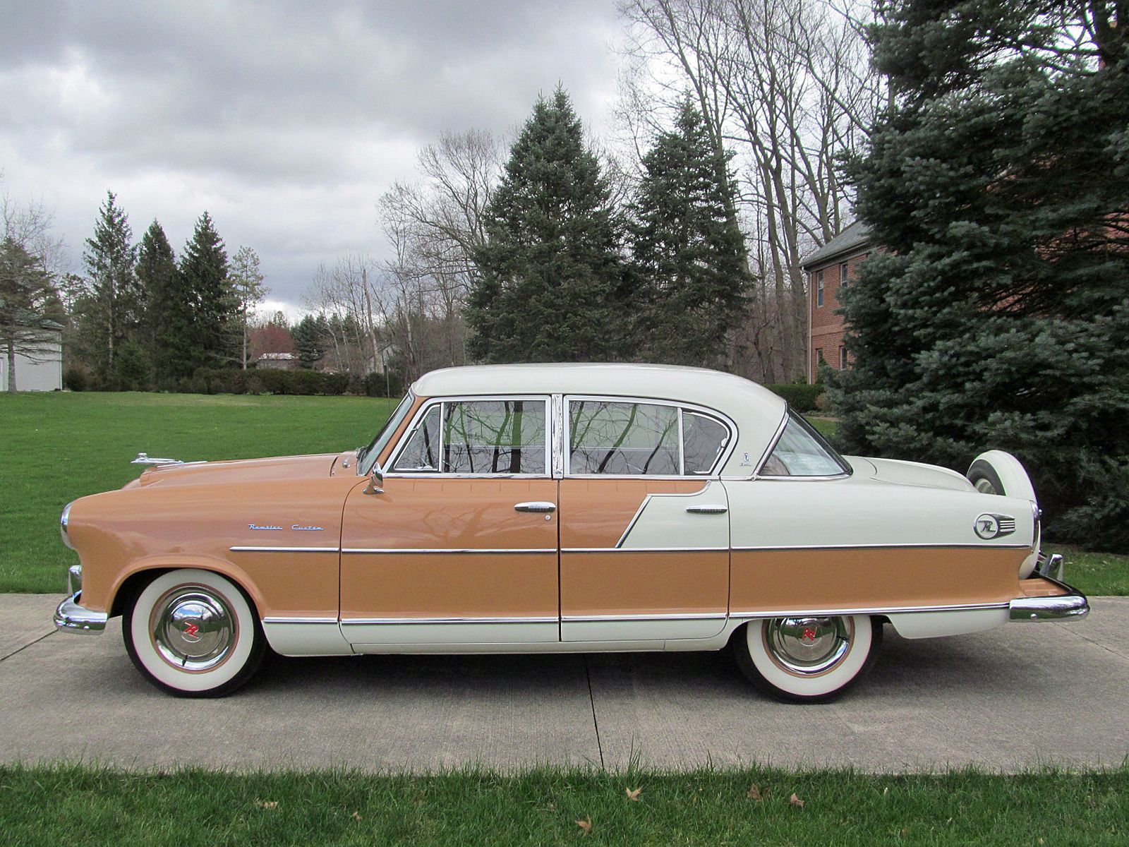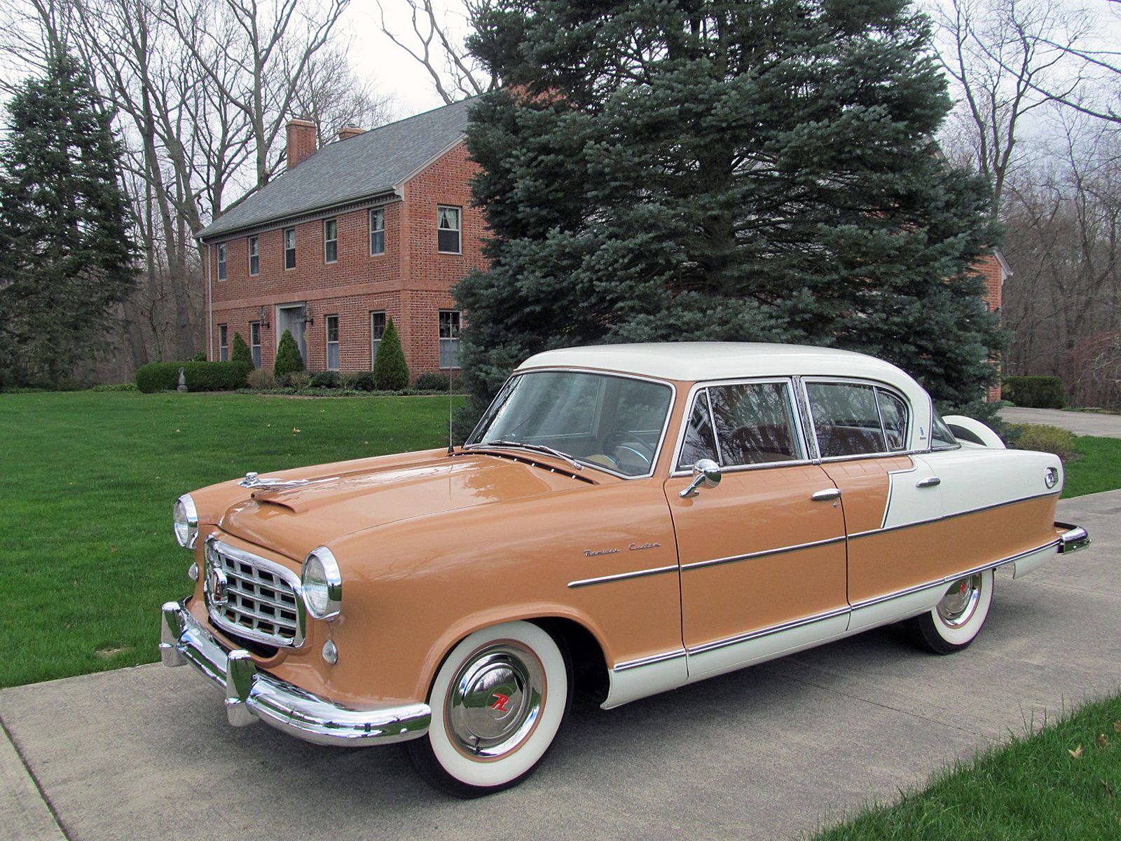 1955 Hudson Rambler Custom Sedan by Nash with OVERDRIVE! Call Pete or Andy 419-668-1884. Outstanding! Restored. Designed by the Italian Design firm Pinin Farina. This great Hudson was built at the Nash Factory in El Segundo California. Only 7,210 examples were produced. Finished in Color Code Correct Palomino Brown and Snowberry White. Two tone brown interior featuring the “Airliner Reclining Seat” which can be converted into “Twin Travel Beds”. Powered by Hudson’s 195 Cubic Inch Inline 6-cylinder engine which was rated at 90 Horsepower. Three Speed manual transmission with Overdrive. This great Hudson has lots of great features. Solex tinted glass. AM Radio. Clock. Heater / Defroster. A Map Lamp is built into the Cigarette Lighter. Turn Signals. Front Seat Belts. Wide White Wall tires. Ready to Drive, Show and Enjoy. Call Pete or Andy 419-668-1884 BE SURE TO WATCH THE VIDEO!
