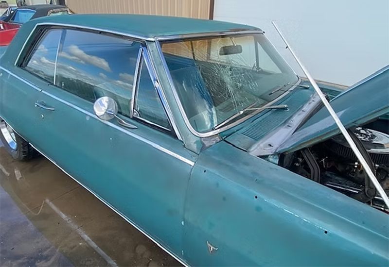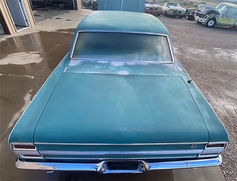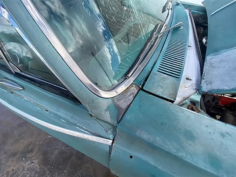 A 2 Dr. Hardtop with substantial front end damage as shown. Car appears correct and original throughout. Power plant is a correct 283 (engine code JD) with Power Glide Transmission. The car looks like it's had one re-paint (likely decades ago), upholstery appears original and in remarkably decent condition. Overall, this is a very solid car, very minimal rust, excellent floors and really clean trunk and jambs. Needs will obviously include frame work or replacement (we have one available) and some front end sheet metal less hood.