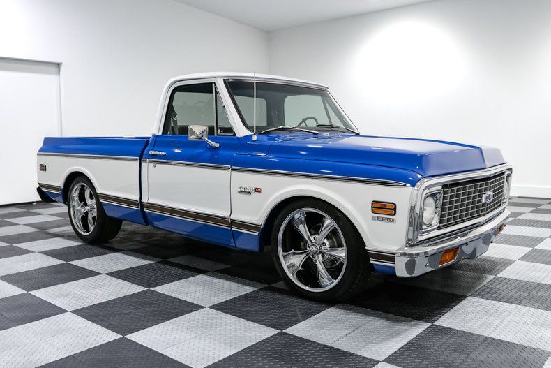 ![]() Click on the image for a larger picture. 1972 CHEVROLET C10 Give us a call at 903-891-0000 with any questions! Financing and shipping available! This 1972 Chevrolet C10 Cheyenne rolls onto the scene with the swagger of a classic workhorse and the guts of a street-savvy cruiser. Finished in an eye-catching Blue and White two-tone paint job, this pickup flaunts timeless '70s style, with modern muscle and attitude lurking beneath the sheet metal. Riding low on 20-inch Ridler wheels and boosted by lowering springs, it's got that perfect stance, ready to cruise or command the pavement. Under the hood sits a classic 350ci V8, armed with a Holley carburetor and an Edelbrock aluminum intake for crisp throttle response. The Hooker ceramic-coated exhaust manifolds feed into a throaty dual exhaust, giving this C10 a growl that's impossible to ignore. A 700R4 automatic transmission makes for smooth overdrive cruising, and with an Optima Red Top battery and CVF serpentine drive system, this rig's ready to roll without skipping a beat. Step inside and you'll find a fresh take on classic comfort. The custom bench seat wrapped in vinyl and cloth provides just the right mix of vintage and modern, while the Dakota Digital VHX gauges give you a precise read on what's happening under the hood. Stay cool with Vintage Air heat and A/C, and grip the Comfort Grip steering wheel while you dial in your tunes with the aftermarket radio. This Cheyenne doesn't just look good-it's built to perform. Power steering and power brakes with front discs ensure it handles and stops with confidence. The aluminum radiator with dual electric fans keeps that small block running cool even in the heat of summer. An aluminum finned valve cover and air cleaner combo add the perfect finishing touch to this engine bay. Whether you're heading to a show, hitting the open road, or just cruising Main Street, this '72 C10 brings the style, performance, and street cred that made these trucks legends. A seamless blend of classic Chevy heritage and modern upgrades, it's ready for whatever you throw its way. VEHICLE OPTIONS: - Hooker Ceramic Coated Exhaust Manifolds - Power Steering - Power Brakes - Front Disc Brakes - Dual Exhaust - Vintage Air Heat & A/C - Two Tone Paint - Optima Red Top Battery - Lowering Springs - Holley Carburetor - Edelbrock Aluminum Intake - Dakota Digital VHX Gauges - CVF Front and Serpentine Drive - Custom Bench Seat - Core Support Cover - Comfort Grip Steering Wheel - Chrome Alternator - Cheyenne - Aluminum Radiator with Dual Electric Fans - Aluminum Finned Valve Covers and Air Cleaner - Aftermarket Radio - 20 Inch Ridler Wheels OPERATIONAL ASSESSMENT: Functioning: Yes/No Yes - Brake Lights Yes - Headlights Yes - Oil Pressure Gauge Yes - Runs Yes - Tachometer Yes - Temperature Gauge Yes - Wipers Yes - Air Conditioning Yes - Fuel Gauge Yes - Heater Yes - Radio Yes - Speedometer Yes - Tail Lights Yes - Turn Signals No - Horn
