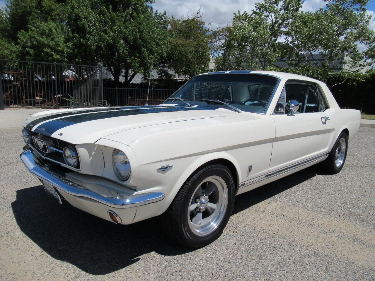 ![]() Click on the image for a larger picture. 1965 FORD MUSTANG GT This is one sweet restomod GT! Finished in Wimbledon White with Blue GT stripes and complimented by White and Blue deluxe Pony interior. Upgrades include a detailed and polished fuel injected 302 V8 backed by an automatic overdrive transmission for freeway cruising, aluminum radiator with electric fan, power steering, 4 wheel power disc brakes, sub-frame connectors with traction bars, updated A/C, rally pack gauges, center console, GT fog lights, dual sport exhaust, old school American Racing wheels and modern stereo system. The previous owner was the president of the local Mustang club and put countless hours into this car over the years and it shows!