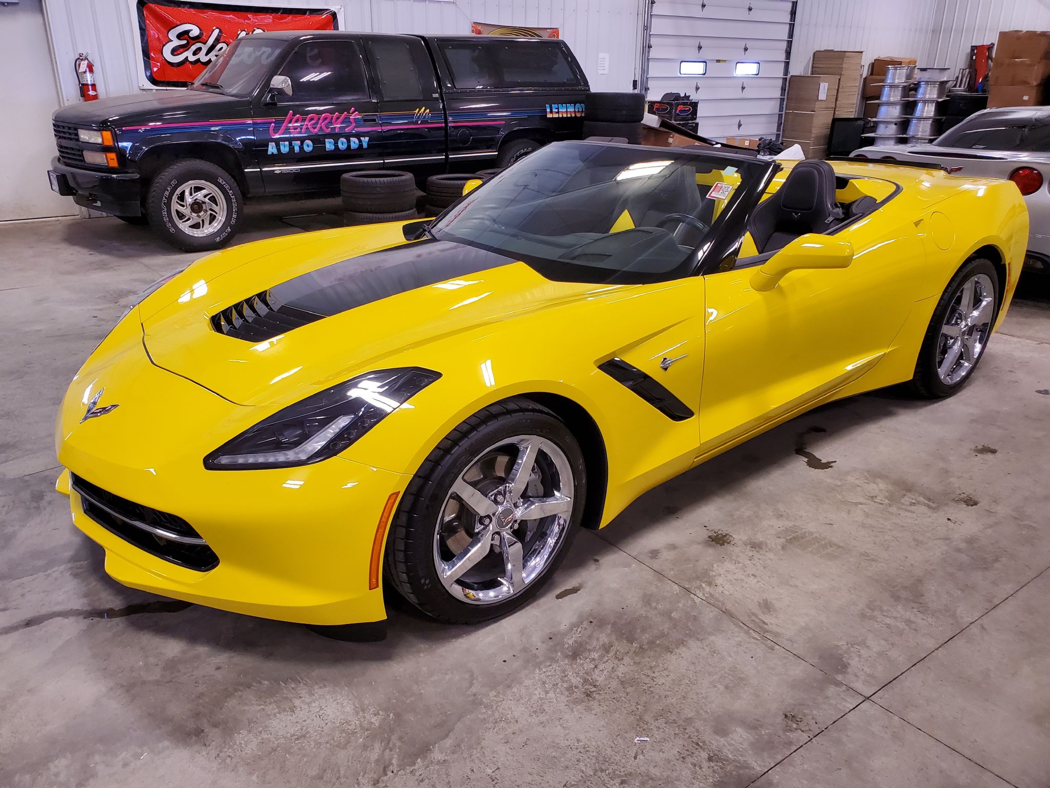 ![]() Click on the image for a larger picture. 2015 CHEVROLET CORVETTE STINGRAY CONVERTIBLE Velocity Yellow w/Carbon Flash Metallic hood Stinger stripe/Jet Black w/custom Yellow bolster sport seats/Black top. 460hp LT1, 8 speed paddleshift automatic, 3LT preferred equipment group, heads up display, p/heated & ventilated seats, Bose Centerpoint audio system w/nav & steering wheel controls, performance data recorder, XM satellite radio, Onstar, Bluetooth, leather flat bottom steering wheel, dual zone air, memory, floor mats, sueded upper interior trim, chrome badging, dual mode performance exhaust, Gray brake calipers, chrome wheels, recent Michelin Pilot Sport ZP tires. Warranty start date 9/12/2014. Local trade. Sold at Jerry’s. Only 23,400 miles. Our price: $53,997. Stock #DC3732