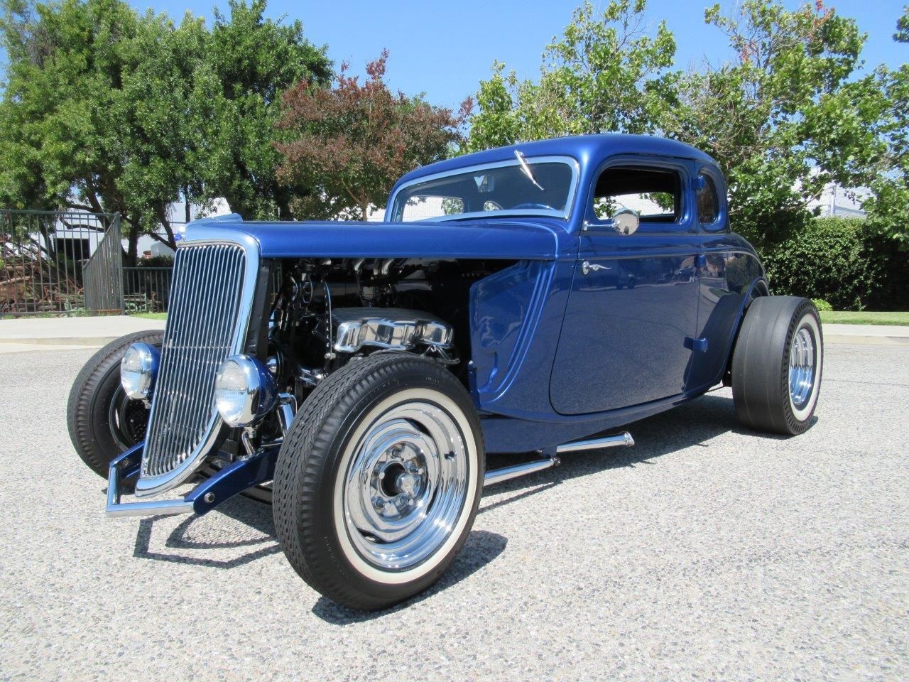 ![]() Click on the image for a larger picture. 1934 FORD 5 WINDOW CUSTOM This one was built the old school way from the ground up with period correct Hot Rod favorites! This all original steel bodied 34 Ford Coupe has a 3 inch chop along with a recessed firewall, filled cowl, pop out windshield, louvered hood and finished in a beautiful Montego Blue Pearl Metallic. The chassis is highly detailed and painted to match, boxed and strengthened, 32 Ford pinched frame horns, powder coated suspension components, drop axle with early Lincoln brakes, 58 Edsel 9 inch rear with 3.55 gears and custom fuel tank. Sitting pretty for all to see is a fresh built W block 348 Chevy V8 with polished finned valve covers, original tri power intake manifold, 3 new Stromberg carburetors, cast iron exhaust manifolds, custom dual exhaust to the rear with side exit lake pipes and removable block off plates if you want to make some noise. The only modern feature for drivability is a 5 Speed manual transmission with hydraulic clutch so freeway speeds are not an issue. The wheels are staggered 15 inch chrome steelies with old school wide whites with cheater slicks to complete the bad boy look. The interior is a blast from the past with a 51 Ford Steering wheel, machine spun dash insert, Stewart Warner gauges, vintage Sun Tachometer, Black Vinyl with cloth insert seats, deluxe Black carpets and Hurst floor shifter. This stunning Hot Rod won it’s class at the 2011 Grand National Roadster show and has only clocked a little over 1300 miles since it’s completion.