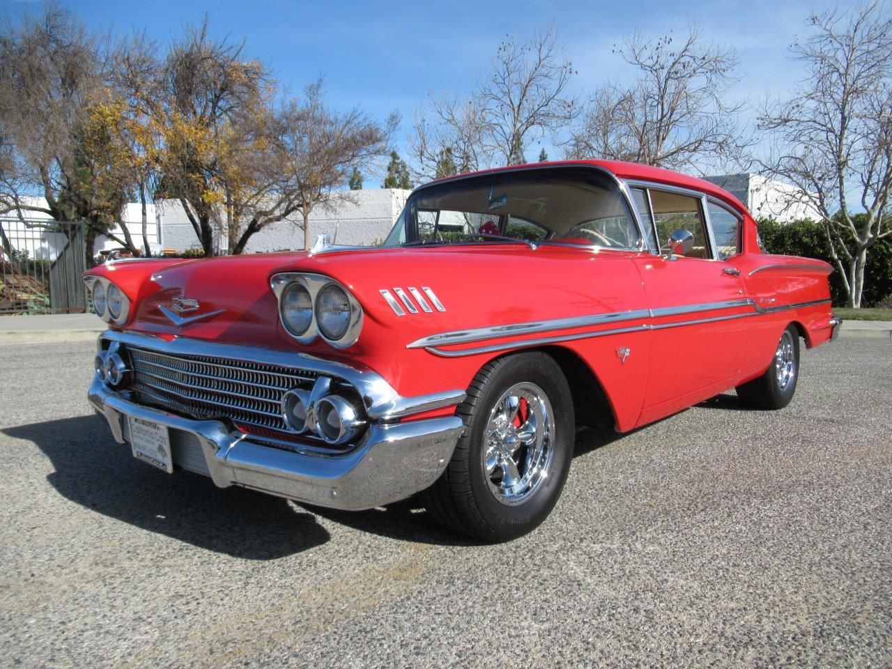 ![]() Click on the image for a larger picture. 1958 CHEVROLET BISCAYNE This is a very nice old school Hot Rod Chevy Biscayne that was owned and loved by Actor/Comedian/Musician Bob DeSimone known for his part in the Classic Horror film Friday the 13th. Painted in a brilliant Torch Red finish with nice bright work and an incredible custom Ferrari Tan Leather interior with comfortable power bucket seats, LED lighting, center console for storage with built in gauge package, Custom Auto Sound Stereo system with Bluetooth connectivity, sound deadener throughout for noise and heat reduction, one off custom color matched steering wheel and custom headliner. The drive-train is equally impressive with a massive and torquey detailed 454 V8 under the hood with a polished aluminum intake manifold, chrome Holley dual feed carburetor, Finned aluminum valve covers and air cleaner, HEI ignition, Chromed exhaust manifolds with dual Flowmaster mufflers, old school Muncie 4 Speed manual transmission, stock rebuilt rear differential with 3.08 ratio for easy freeway trips, front and rear sway bars, 4 wheel Hydroboost disc brakes, CPP close ratio power steering, electric parade fan if you get stuck in stop and go traffic and a nice set of 15 inch Chrome American Racing wheels on all four corners! This one is ready to go and collect some trophies!