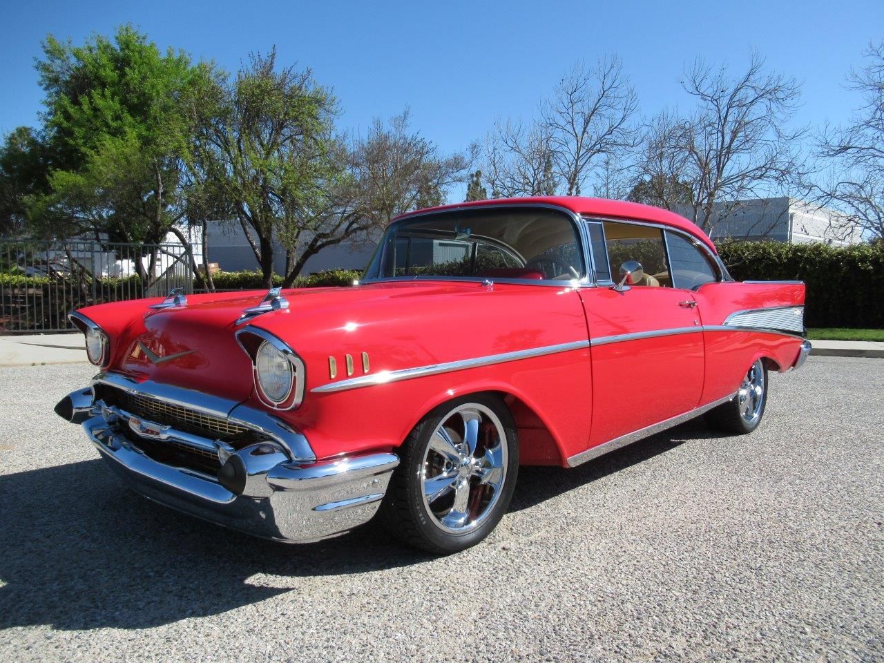 ![]() Click on the image for a larger picture. 1957 CHEVROLET BEL AIR If you have a thing for trophies this one will rake them in! This frame off restored 1957 Bel Air looks as good underneath as it does on top. Finished in stunning Torch Red paint with beautiful Chrome and polished stainless steel trim throughout. The award winning Ambrose Tan interior is super comfortable with the softest supple materials, front reclining bench with fold down arm rest, power windows with new smoked glass, LeCarra Leather wrapped billet steering wheel with tilt column, Lokar floor shifter, Vintage A/C, Custom electronic analog gauges, Custom Auto Sound stereo with Aux phone connection, power antenna and trunk mounted disc changer. Under the hood is a true work of art with a highly detailed 383 Stroker motor rated at 573 Horsepower and 502 foot pounds of Torque, Edelbrock aluminum heads, polished aluminum intake, Vortech Supercharger, polished aluminum radiator and A/C condenser, serpentine belt system, 700R4 automatic overdrive transmission with trans cooler, Doug’s headers, electric muffler bypass valves with complete stainless steel exhaust all the way to the rear. The front suspension is a Heidts unit with chrome tubular control arms, close ratio power steering, QA1 adjustable shocks, 4 wheel power disc brakes, powder coated frame and Fab 9 rear differential, race axles, tunable Cal-Tracs traction bars and a cool looking set of Chrome staggered 17 and 18 inch Foose Legend wheels wrapped in BF Goodrich G Force performance radials. Save yourself 3 years and half the money and be driving it this weekend!