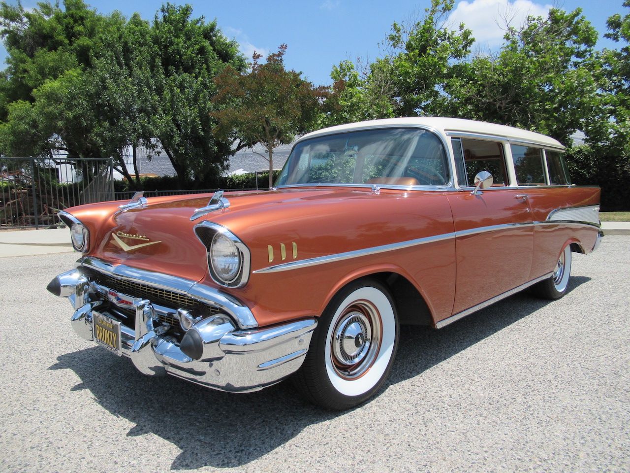 ![]() Click on the image for a larger picture. 1957 CHEVROLET HANDYMAN Check out this super cool 57 two door wagon with some tasteful comfort upgrades. Finished in a beautiful Sierra Gold Metallic and Imperial Ivory two tone, factory Charcoal and Ivory interior, AM Radio and under dash Vintage A/C system. Under the hood looks stock but has a great running mid 60’s 327 V8, camel back heads, aluminum Corvette valve covers, Carter 4 barrel carburetor, alternator conversion, electric fan, power steering, dual exhaust with old school Glasspack mufflers headed all the way out back, 2 speed Powerglide automatic transmission and a nice set of brand new wide white wall radial tires wrapped around the original color matched steel wheels with dog dish hubcaps and trim rings. This is ready for some vintage surfboard racks or to take the family out for milkshakes for a fraction of the cost of a nice Nomad these days!