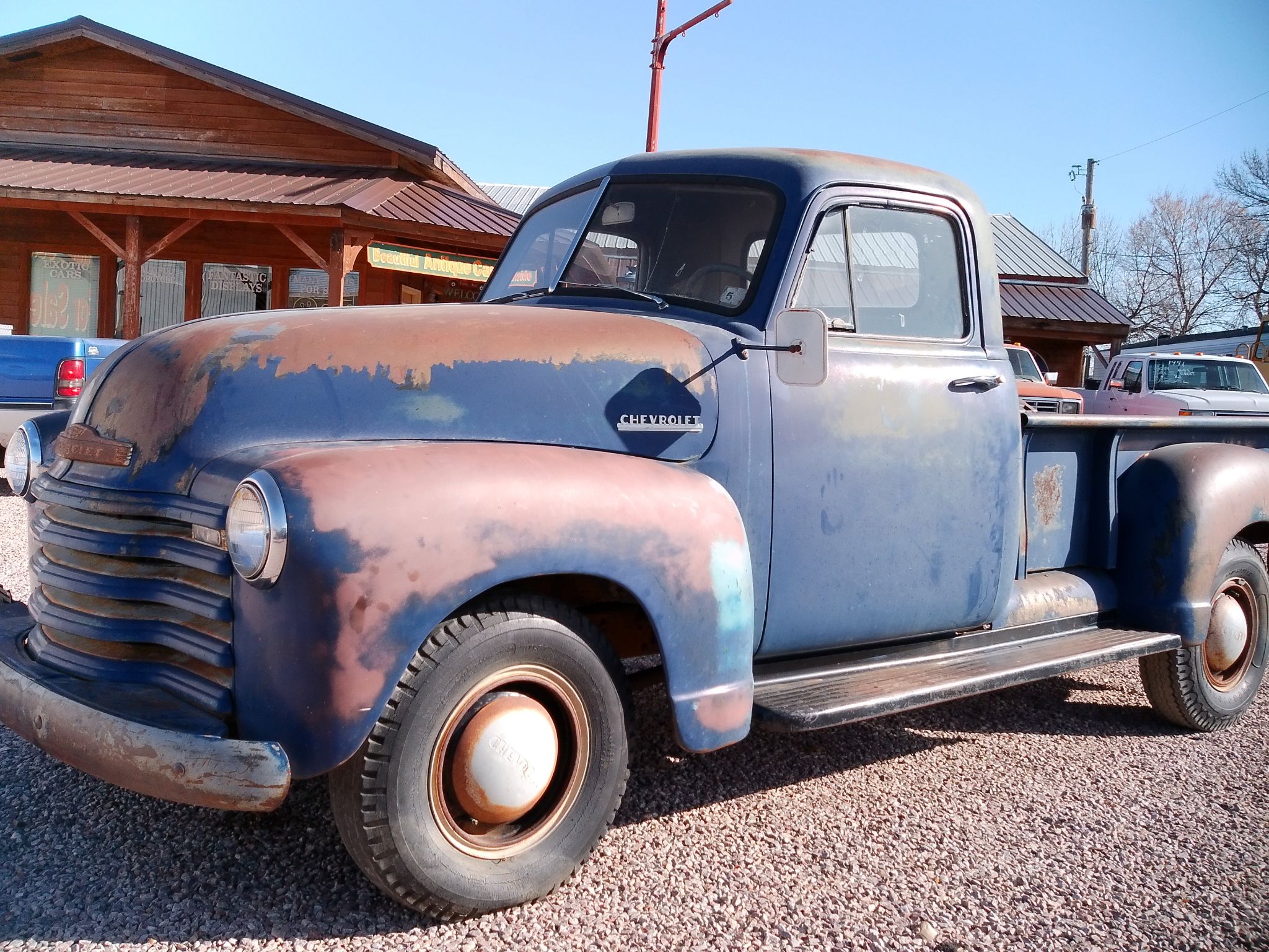 ![]() Click on the image for a larger picture. 1952 CHEVROLET PICKUP LONG BOX 3/4 TON SORRY, BUT WE JUST SOLD THIS PICKUP! CHECK OUT THIS AWESOME ORIGINAL UNMOLESTED CHEVY 3/4 Ton 2 Wheel Drive Pickup! What FIND! This truck is one of those: RARE FINDS! A One local family owned truck just waiting for it's new home. And shows ONLY 19,000 miles on the odometer. This truck is original, nothing changed or modified. No damage/hail dents. Look at that CHERRY Griille! Super Clean, with just the right patina. Virtually Rust Out Free! Floors, Cab Corners, Awesome Straight Running Boards. Had the factory block out plate over the radio on the dash. This truck never had a radio, as it was an add on back in 1952. So, dash is ready for your own radio. Look these photos over. 6 cylinder engine, with 4 speed. Runs sweet, and the clutch works. I hooked up a gas tank and it started right up. Will need a fuel pump,& tires. You need to bleed the brakes, and you should be on the road. Lights work, even dash lights, gauges, and horn works. Original 6 Volt system. Cracked drivers side windshield flat glass. The original tailgate is in the bed. Wood in box floor needs to be replaced. If you are looking for a good original solid pickup, don't miss this one. Comes with Clear Title, AND WE DON'T CHARGE YOU ANY EXTRA TITLE/DOCUMENT FEES. Shipping is available. PRICED AT ONLY $7,800. Call Bill @ Motion Unlimited Museum and Classic Vehicles Sales, Rapid City, South Dakota. 605-348-7373.
