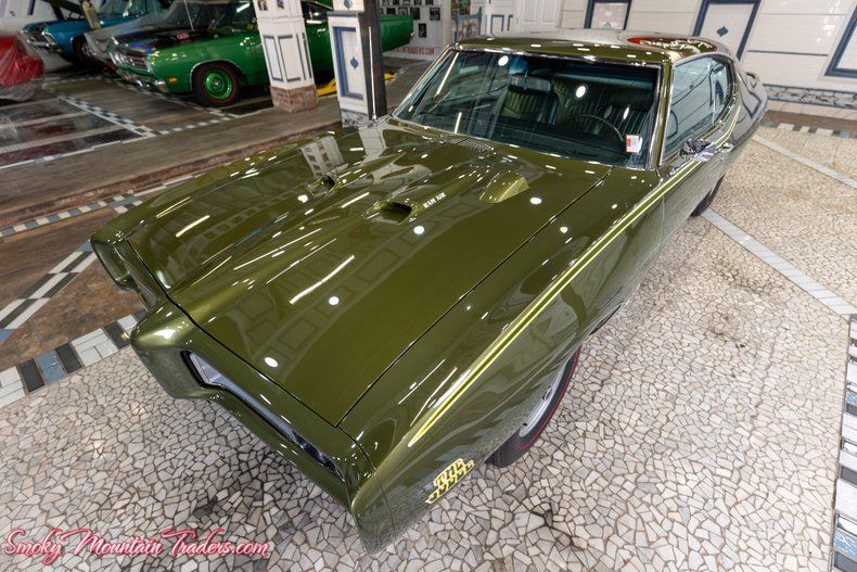 Next, we will look at the interior of this GTO. On the inside, it follows suit with the exterior as it's done in the factory option and is in beautiful condition. The factory green option flows perfectly with the Verdoro Green paint. It comes with the factory-optioned bucket seats and console that houses the Hurst Shifter. Both the front door panels and the rear side panels are in great condition along with their trim and handles. The front buckets and rear bench seats are in excellent condition from the padding to the covers. This '69 does have the original seat belts as well. Both the carpet and headliner are in excellent condition and have a phenomenal fit. Looking at the dash we can see the pad is stunning as well along with the glove box. All the factory gauges look amazing and are working as they should. Also, it comes with the factory Pontiac steering wheel. Inside the trunk it's rock solid from the pan to the trunk jam. We can see it has new weather stripping and is finished with the factory spare and jack combo.