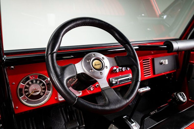 The recipient of a full body-off restoration, this Bronco's bright red exterior with contrasting black accents is sure to capture attention wherever it goes. Lifted suspension and custom 17" Centerline aluminum wheels wrapped in Toyo Open Country Mud Terrain tires provide the perfectly aggressive stance. Tubular front and rear bumpers add rugged protection, while a full custom roll cage enhances safety and structural integrity. And a full soft top is included with the sale, as well as the bikini top.