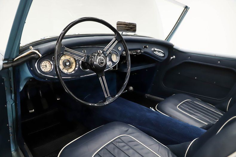 INTERIOR: Quaint and comfy! It's a really fun experience sitting so close to the road and throwing around that 4 speed manual shifter. All the seats have been recovered in navy blue genuine leather with very tasteful white piping that accents the exterior. The banjo style steering wheel and the Smiths gauges look so cool and appear to be original. There is an overdrive/normal switch for the transmission. Everything has been refinished and looks great including the dash pad, door panels, and carpeting. It has rear seats making it a 2+2.