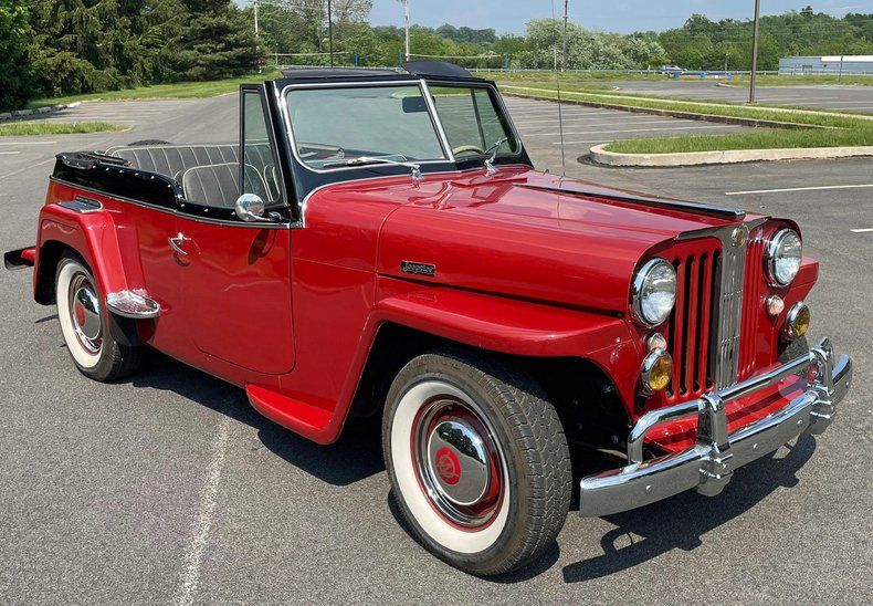 1948 Willys Jeepster, gorgeous Harvard Red and Black paint, excellent Black interior, Black soft top and side curtains, great chrome, only 1,200 miles on the restoration, upgraded to a GM 2.5 liter 110 HP 4-cylinder engine, 4-speed synchromesh transmission, rack & pinion steering, power disc brakes, 12-volt electrical system, a full set of Auto Meter gauges, tilt steering wheel, AM/FM/Cassette, bumper guards, grill guard, fog lights, deluxe heater, electric wipers, wide white radials, runs and drives great, fun in the sun!