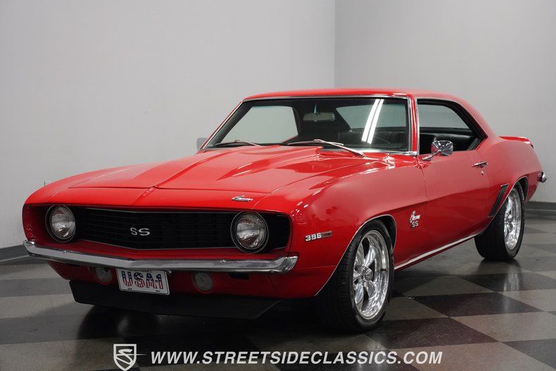This sharp 1969 Camaro SS 454 Tribute is finished beautifully Red that has a deep, mirror-gloss shine. Features include a cowl hood, rear spoiler, chin spoiler, SS 396 badging, Big Block-style blacked-out tail panel and an all-black grill. Complementing the clean look of this classic Camaro is a set of polished 17-inch five-spoke Rev wheels wrapped with tires staggered 225/45ZR17 front and 245/45R17 rear for a confidant stance. Without the commonly seen stripes on the hood and trunk, this Camaro shows off its sleek and muscular shape, emphasizing the clean styling that has made it widely considered one of the best-looking cars Chevrolet ever created.