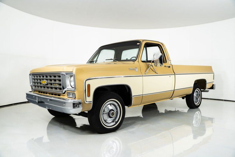 This 1976 Chevrolet Silverado is a beautifully preserved example of Chevy's top-of-the-line pickup, showcasing the luxury and muscle that defined the era of full-size trucks. Finished in a rich two-tone Buckskin and Santa Fe Tan paint scheme, this Silverado exudes vintage charm with just the right amount of attitude. Factory 15" steel wheels with hubcaps and radial tires complete the period-correct look, and the long bed and clean body lines give it that unmistakable '70s truck presence.