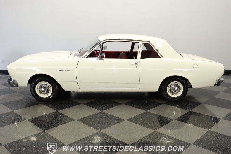 The red interior creates a bold atmosphere inside this Falcon. Vinyl and cloth split-bench seats maintain their form while providing excellent comfort. The dash showcases clear gauges set against glossy paintwork. A column-mounted shifter preserves floor space, and factory seatbelts are present front and rear. A protective rubber floor mat adds durability to the cabin's floor.