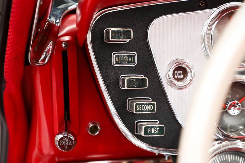INTERIOR: This two-tone red and white interior really pops against the Ermine white exterior. I love the recovered low back bucket seats and original looking center console that has built-in storage, astray and cigarette lighter. The rear seat was also recovered with matching upholstery. The dashpad is not cracked and the visors have been recovered. The gauge cluster is both beautiful and nostalgic and very attractive to look at with a unique vintage font. The oblong steering wheel and push button transmission are some of my favorite features ever on a car. The door panels have also been refinished with matching upholstery and look great. All the chrome has a bright and shiny finish. The builder added a vintage Moroso tachometer to the column and a triple gauge cluster under the dash to monitor the vitals.