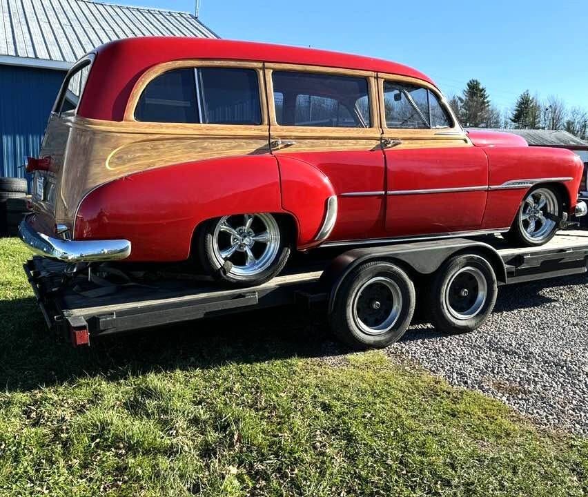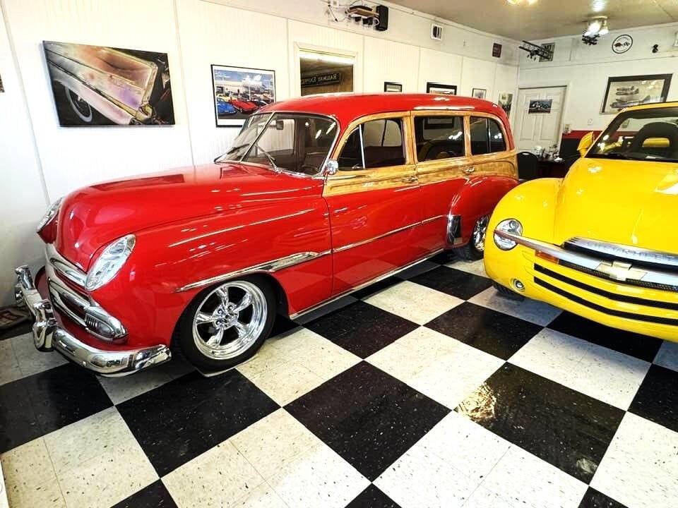 1951 Station Wagon Chevrolet Red Custom Tin Woody 11,800 miles since redone, Drive Any Where !! This one can handle the Family, and Grandkids, (even has a DVD player !) and do it with Style and Uniqueness. Plus It has a Modern Fuel injected V8, A/C , Leather interior, and Room for luggage on a weekend trip! video here https://youtu.be/KPlK_0C0KTY?feature=shared Fuel injected Vortec V-8 engine, Automatic transmission with overdrive, Red with wood detailing Custom Brown leather interior, Grant 3-spoke wood rimmed steering wheel, AutoMeter carbon faced gauges Central dash mounted White faced clock, Power windows, Upgraded Pioneer audio system Aftermarket air conditioning ,Power front disc brakes, Mustang II front end with rack and pinion steering Eagle chrome 5-spoke wheels, Dual exhaust, Custom headlights, Third brake light