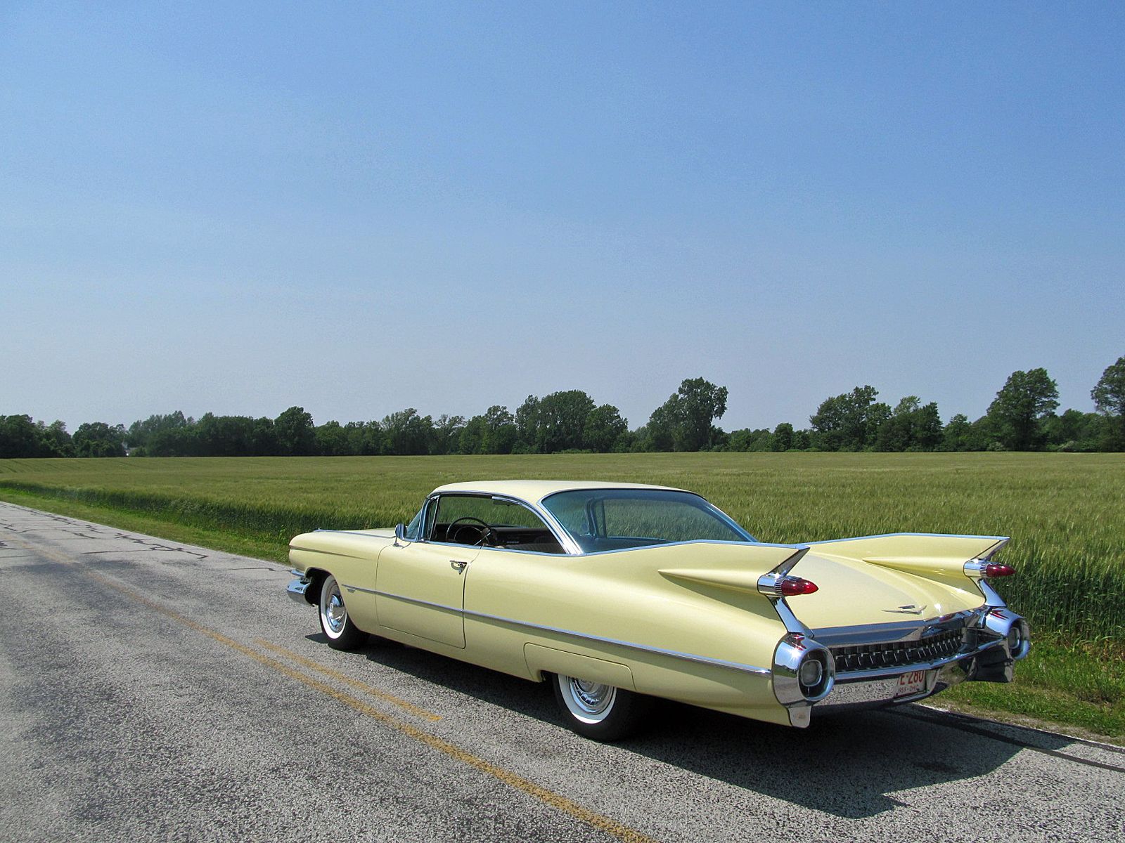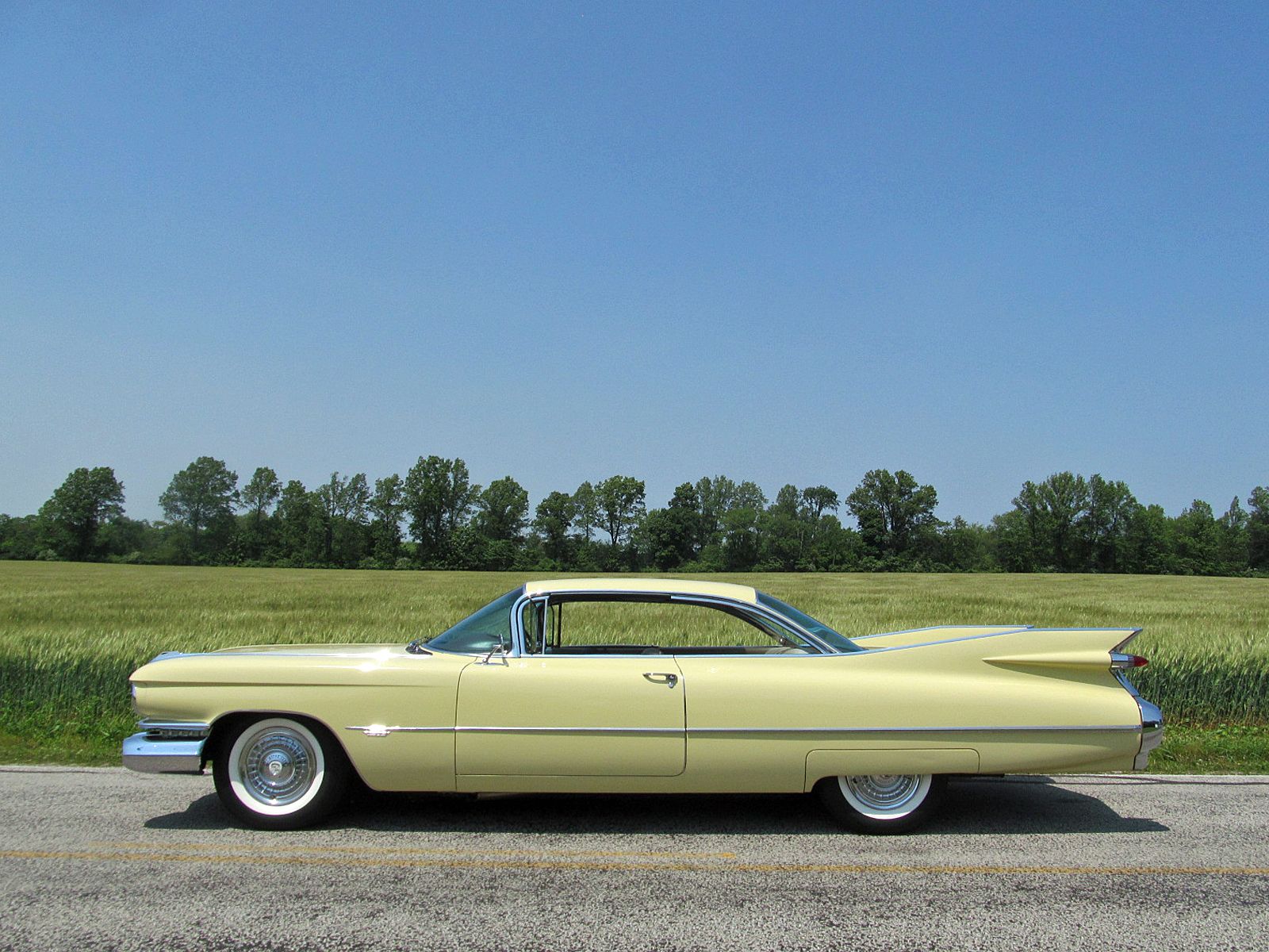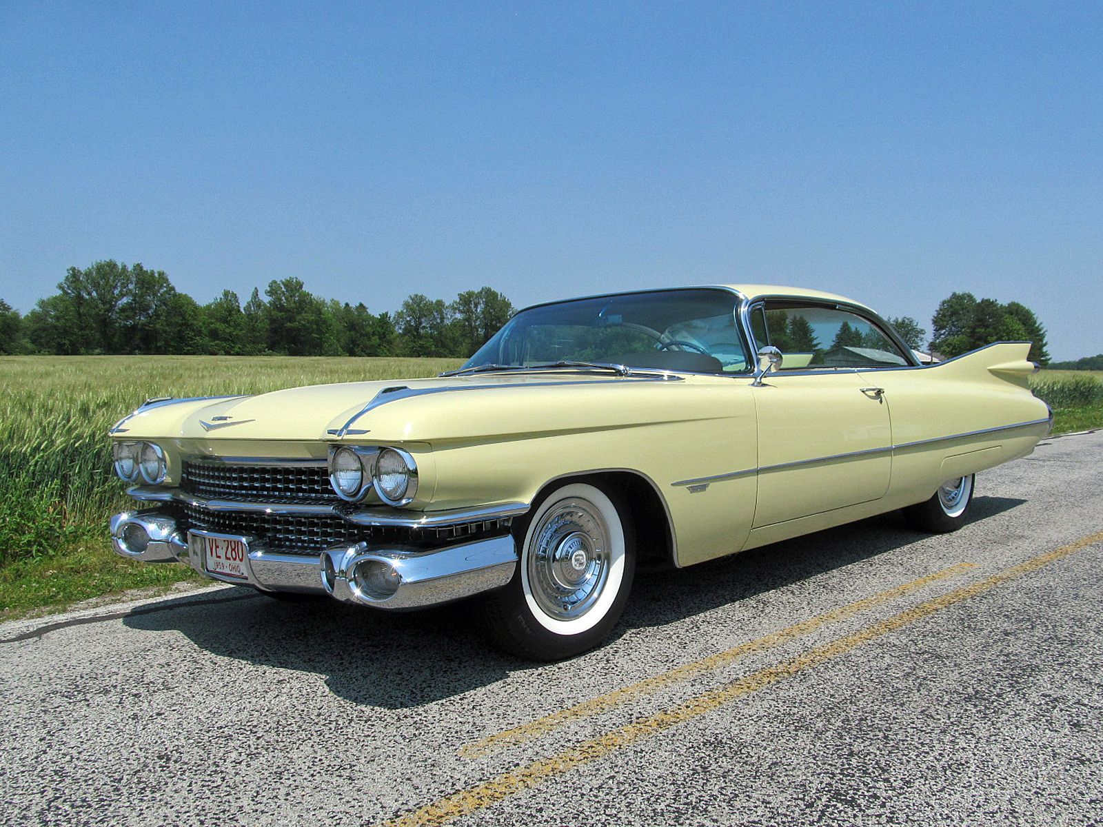 1959 Cadillac Series 62 Coupe. Call Pete or Andy 419-668-1884. The most iconic tailfins ever created! The zenith of jet-age style! Excellent. Style Number 6237. Finished in Color Code Correct number 40 Gotham Gold. The interior is finished in Trim Code Correct number 35 Fawn Mojave Cloth and Fawn Coated Fabric. Numbers Matching Engine, Chassis and Service Tag. Powered by Cadillac’s 390 Cubic Inch V-8 which was rated at 325 horsepower. Dual Exhaust. Hydra-Matic Automatic Transmission. This Cadilac is equipped with lots of great features. Power Steering. Power Brakes. Power Antenna. AM Radio. Clock. Heater / Defroster. Day / Nite Rearview Mirror. Remote Driver Mirror. Front Seat Belts. Rear seat arm rest. E-Z-Eye Tinted Glass. Radial Wide White Wall tires. The doors even lock and unlock with the key! Ready to Drive, Show and Enjoy. Call Pete or Andy 419-668-1884 BE SURE TO WATCH THE VIDEO!