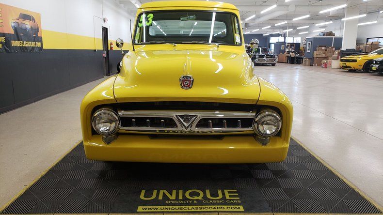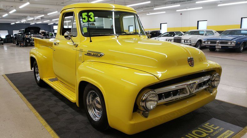 1953 Ford F100 Pickup Street Rod in Yellow paint. 350ci V8 under the hood with a TH350 automatic transmission. Equipped with power steering, Edelbrock 4bbl, and aluminum radiator as well. Steel body truck with fiberglass running boards and rear fenders. Riding on chrome wheels with radial tires. behind the wheel in the passenger wheel well is a battery disconnect switch. Custom gray heather cloth bench seat with custom center console install and radio install. True dual exhaust front to rear. Power tonneau cover in the rear. Aftermarket gauge cluster, tilt column, and power windows. The power window switch has been incorporated into the crank window handles. Stereo works. Truck bed finished nicely with wood and inlays.