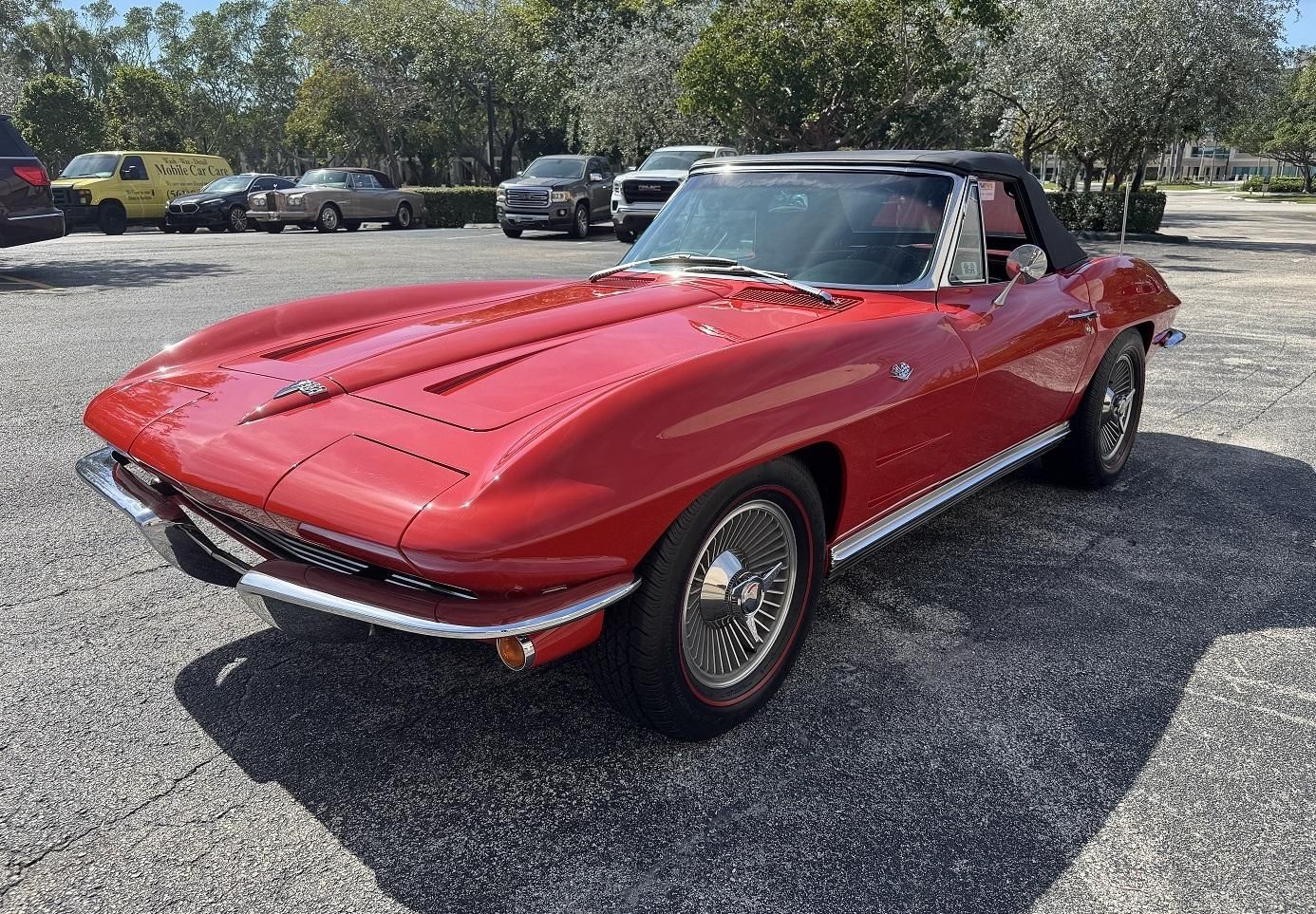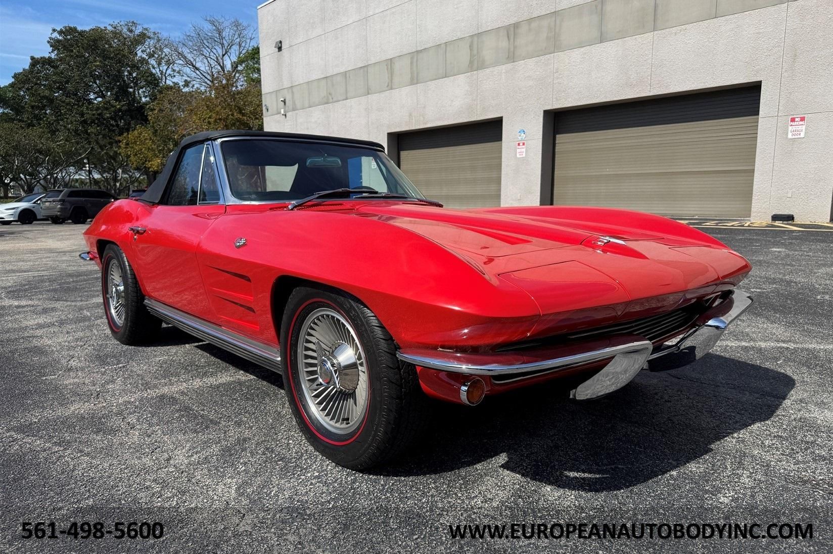 1964 Chevrolet Corvette Stingray Convertible. Red with Black interior, factory hardtop, 327ci V8 engine, 4 speed manual trans., power steering & power brakes. All original body panels & ribs, only one paint job since new. Just 38,435 miles. Stock# 407