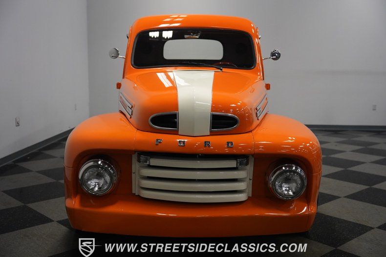 This 1949 Ford F-1 pulls off a masterful visual trick - it's a truck that blends two generations into one, mixing the original '49 grille and hood with the advanced styling of '51-'52 fenders and headlight placement. The result? Pure magic in orange and cream two-tone paint. Custom details abound, from the crisp white racing stripe to the rich wooden bed planks and running boards. Chrome Cragar SS wheels - 15 inches all around - anchor each corner with authority, wrapped in P255/60R15 rubber up front and muscular P295/50R15 tires out back. The bedsides feature unique carpet-like material, adding an unexpected custom touch to this classic hauler.